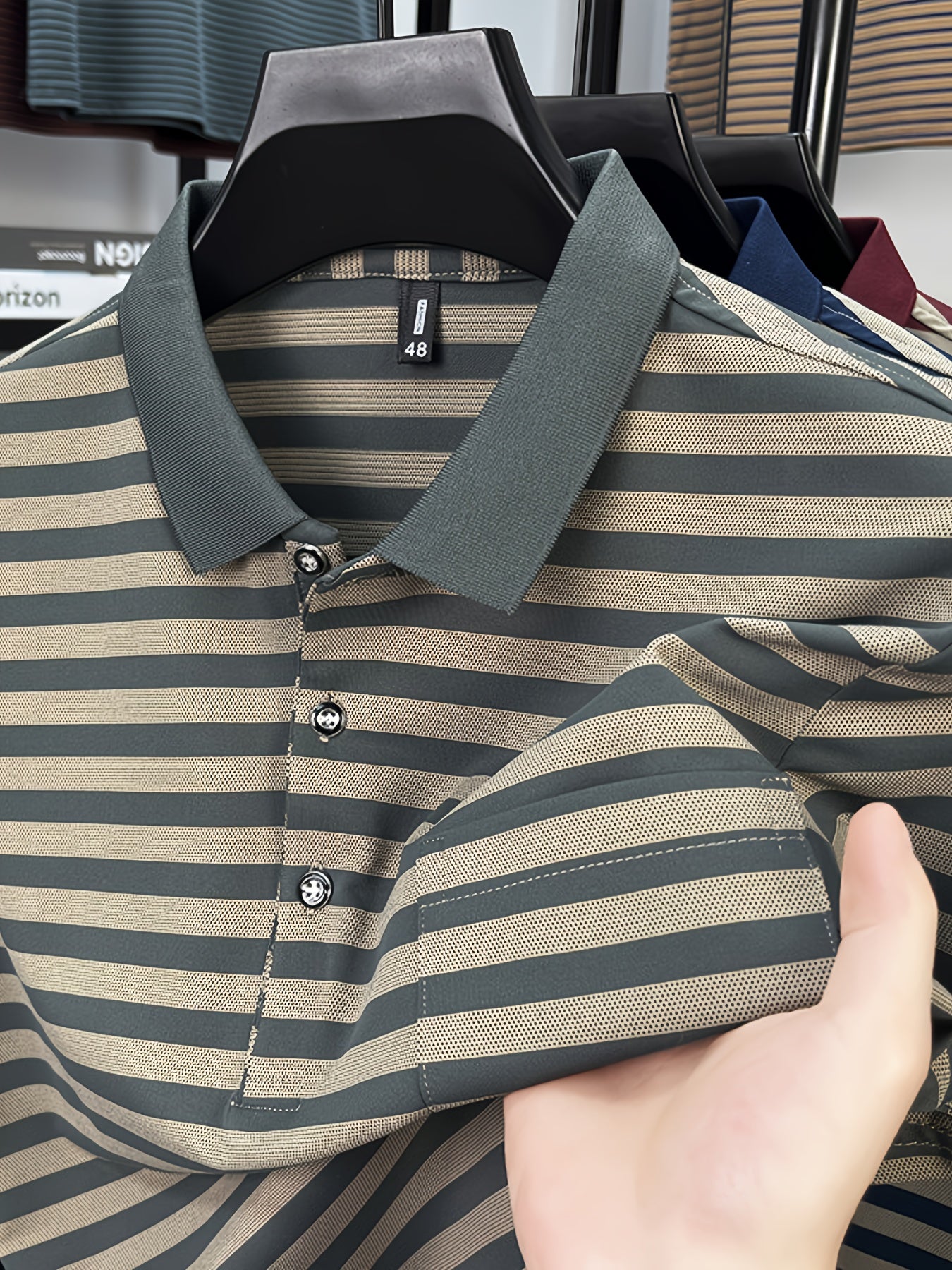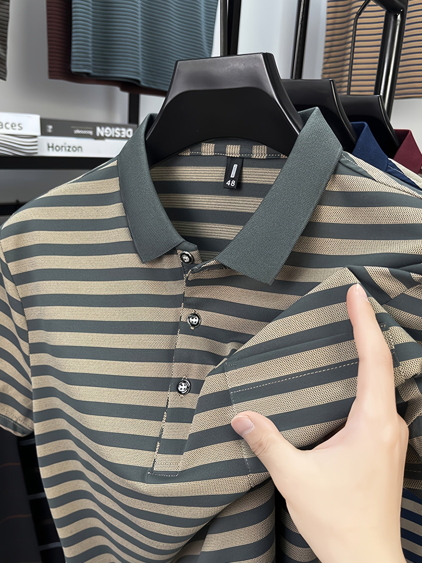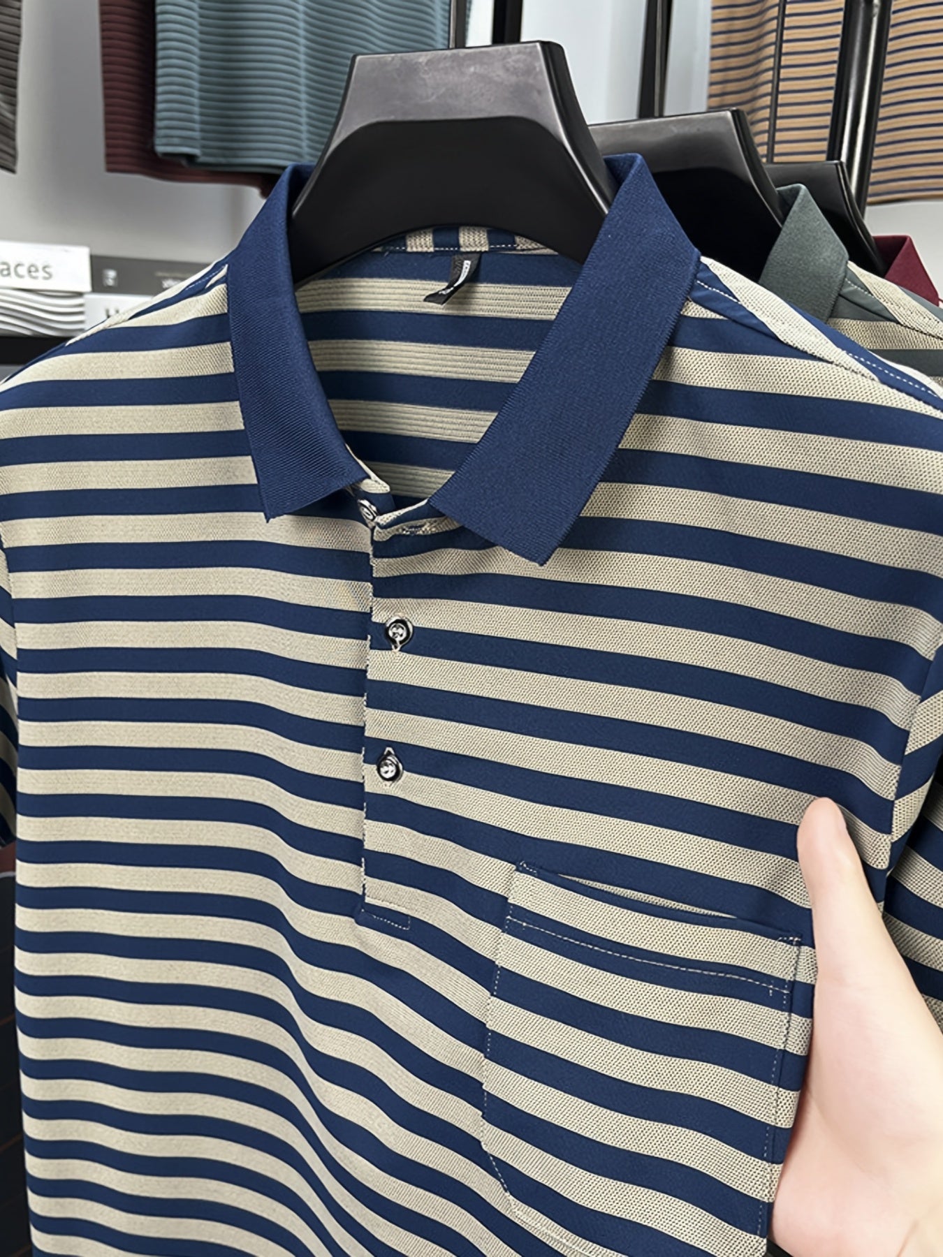 A relaxed polo designed for casual summer wear.Regular fit with light stretch fabric for everyday comfort.Finished with a striped pattern and practical pocket detail.