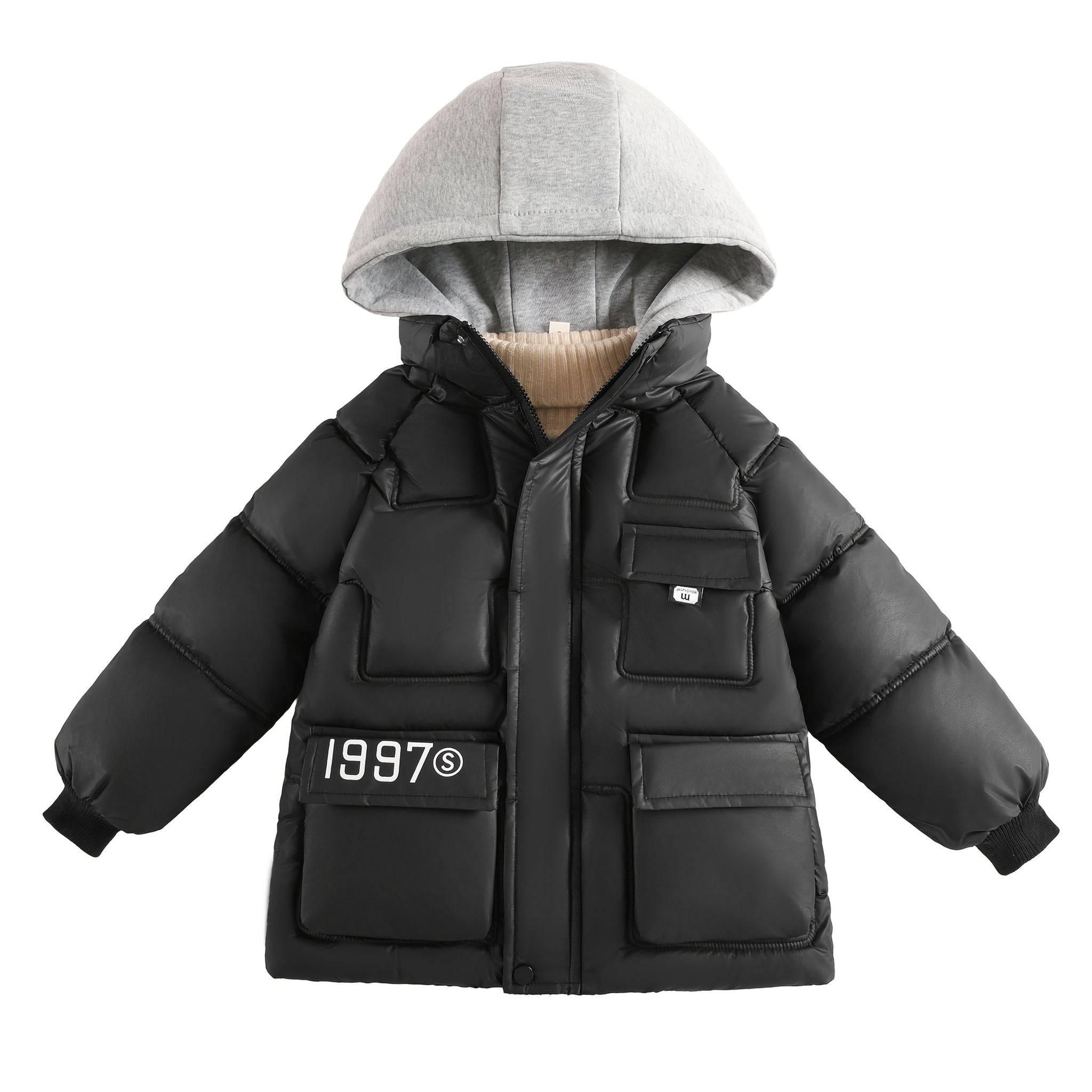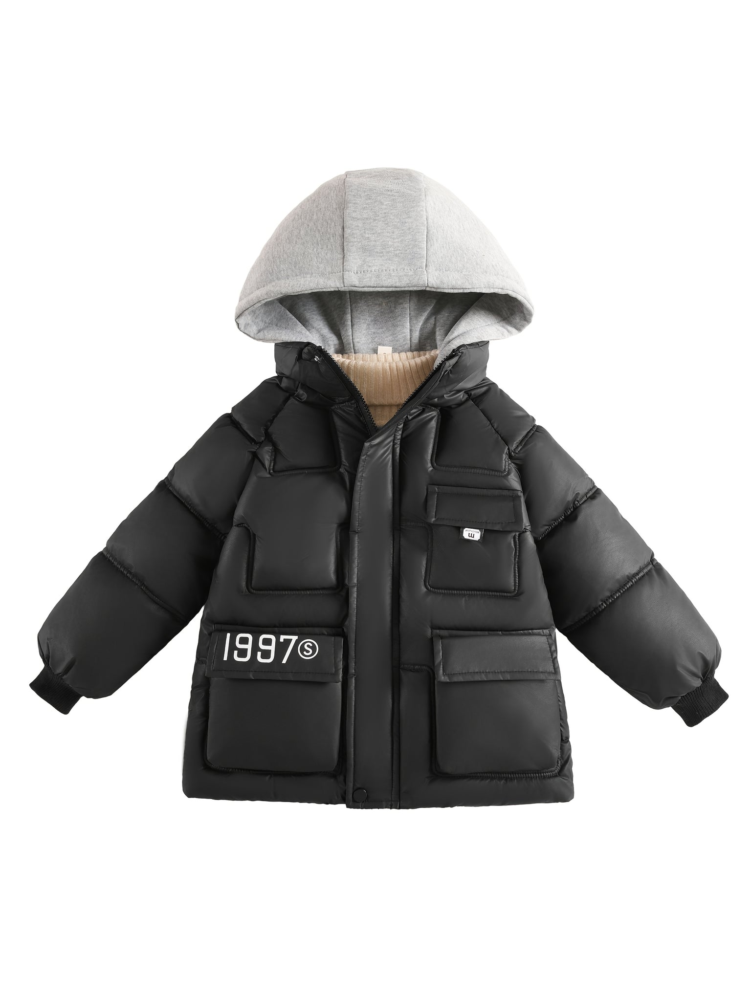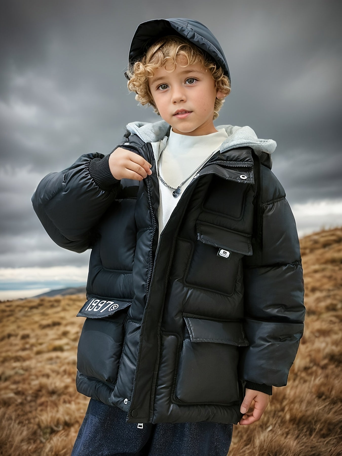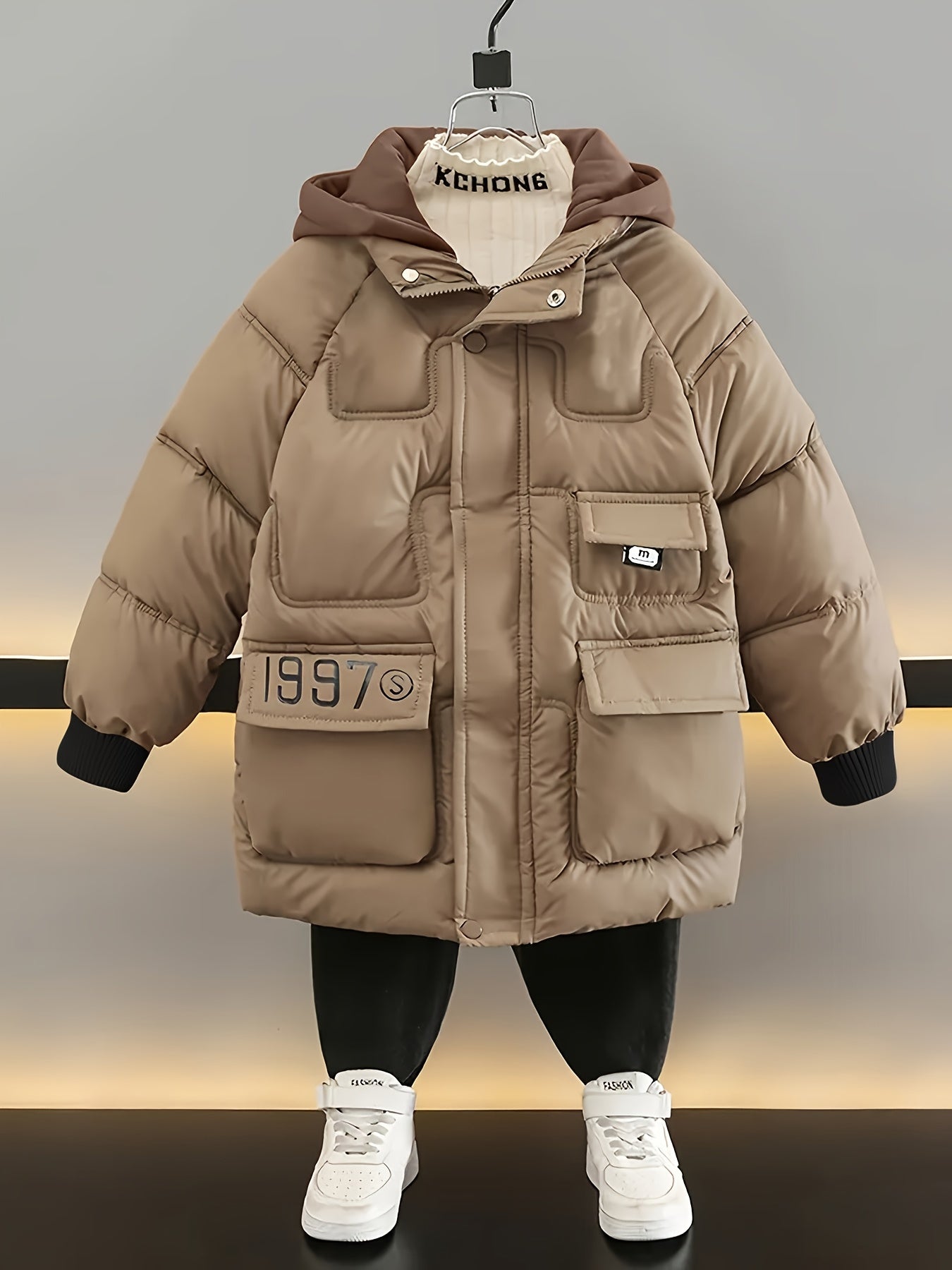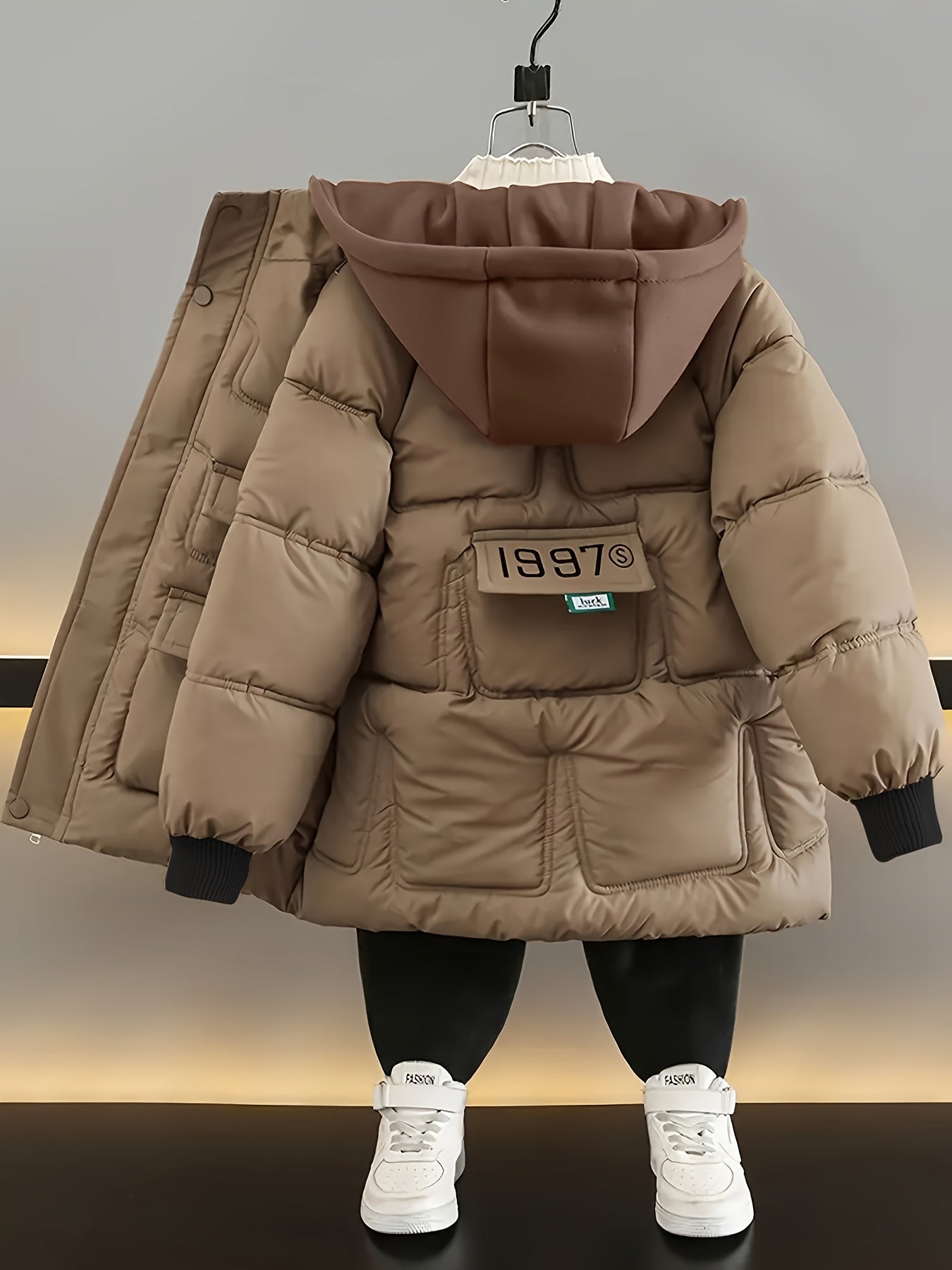 A warm vintage-inspired winter coat for boys, designed with thick fleece lining and a signature “1997” pocket detail. Crafted for cold-weather comfort with a hooded silhouette and durable polyester shell.