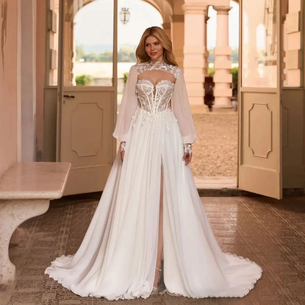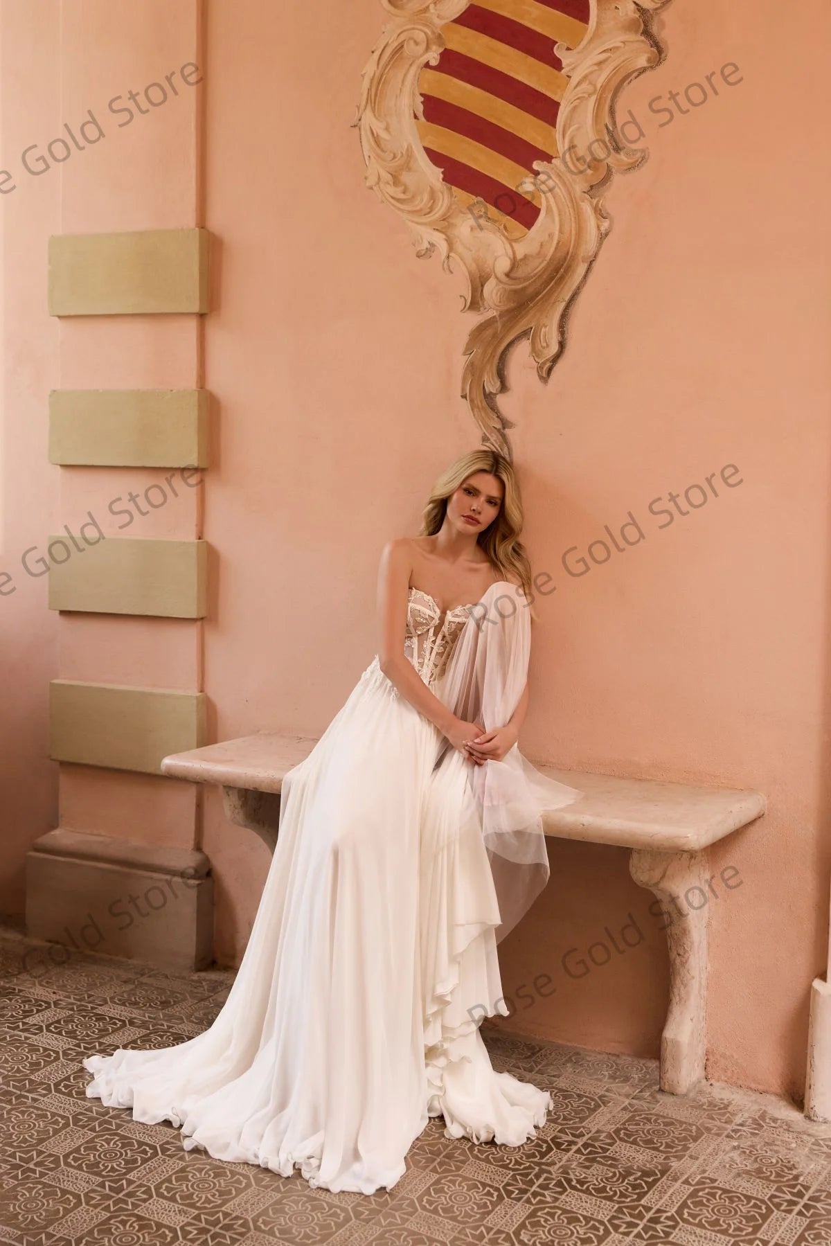 A romantic wedding dress designed for boho-inspired ceremonies.Flowing A-line shape with soft chiffon elegance and timeless appeal.