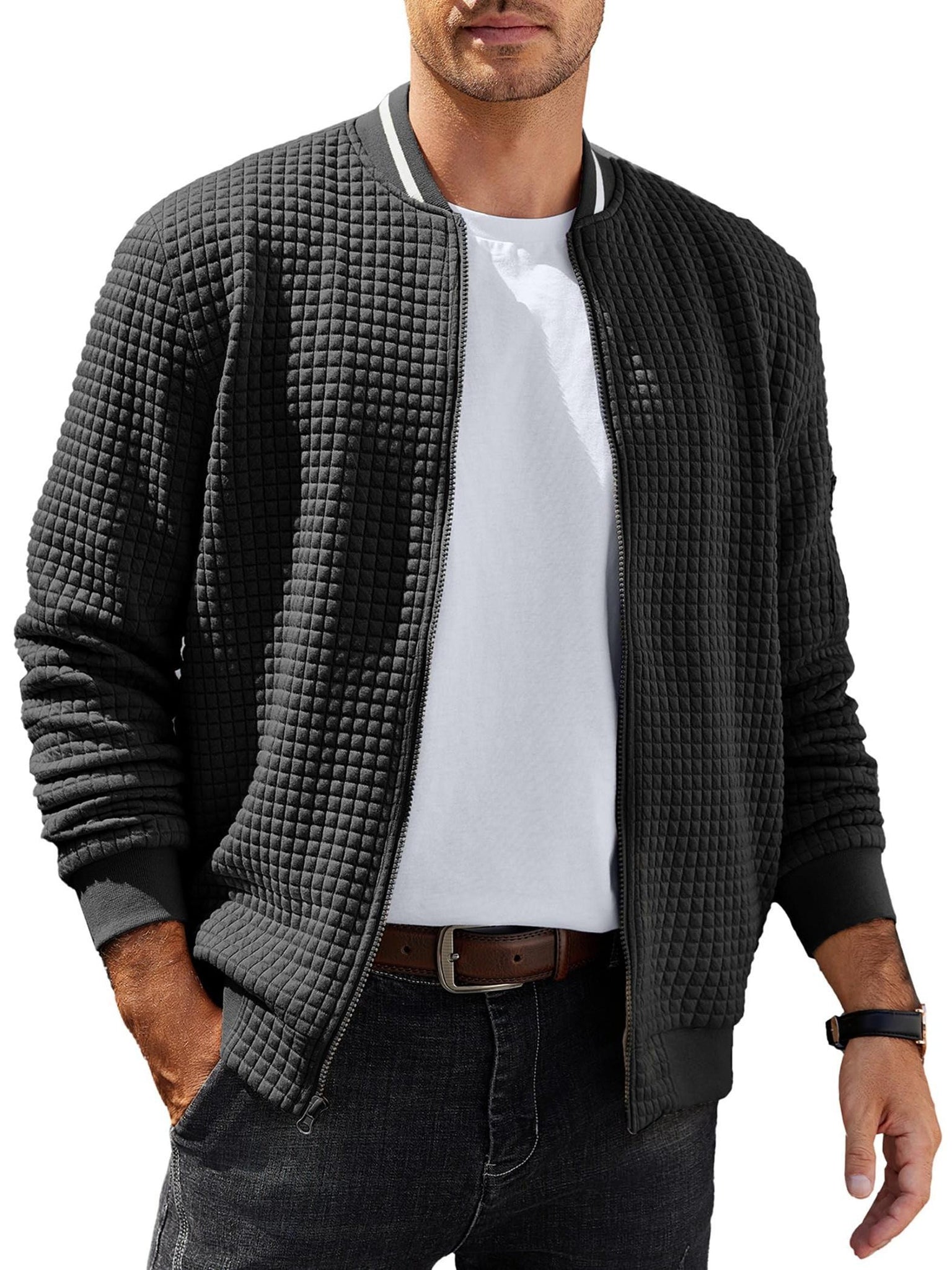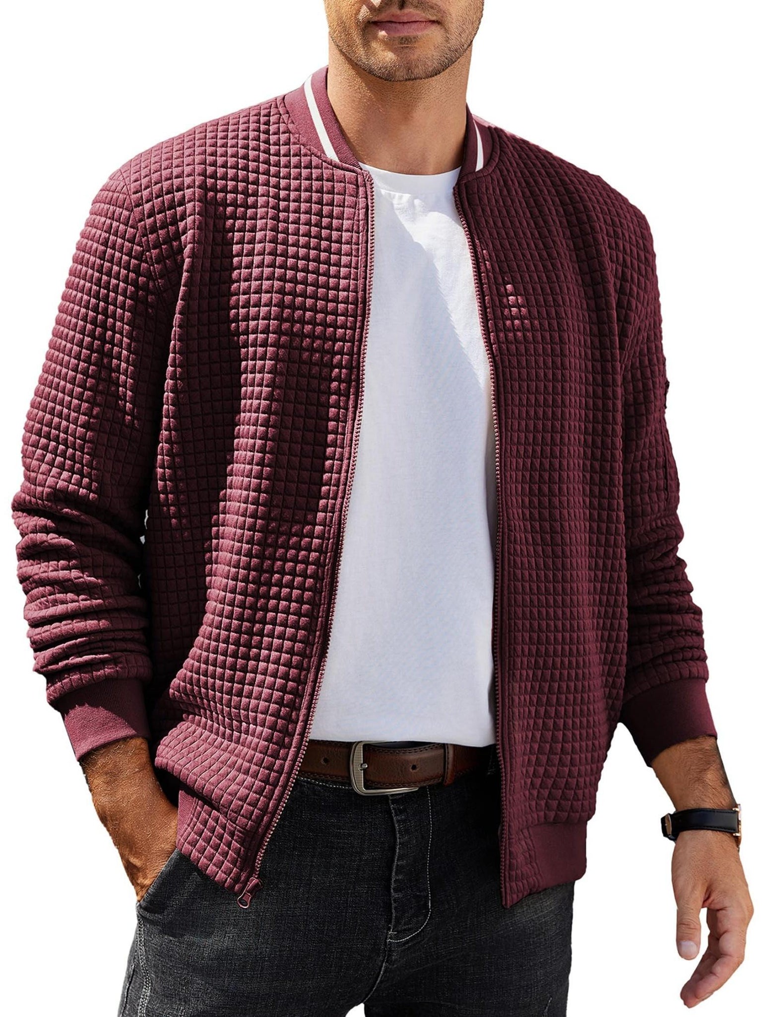 • Lightweight waffle knit construction• Zip-up bomber jacket silhouette• Regular fit for easy layering• Crew neck collar design• Practical pocket detail• Solid color minimalist style• Ideal for casual, weekend, and sports wear