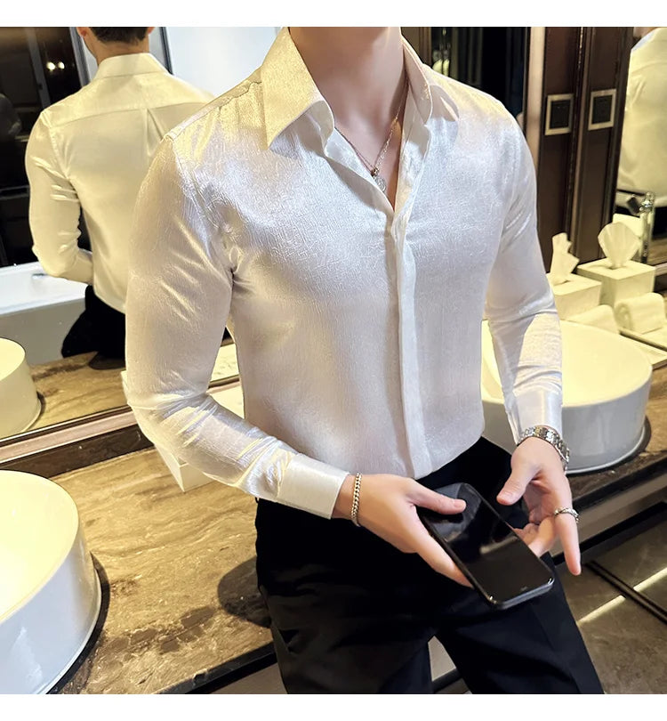 A sleek, glossy dress shirt designed for sharp evening looks and refined casual wear. The silky finish and slim fit deliver a polished, high-end appearance for any social occasion.