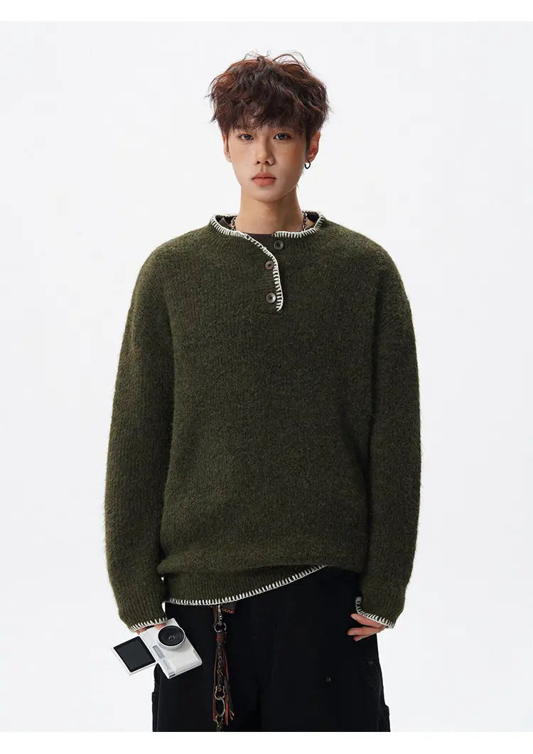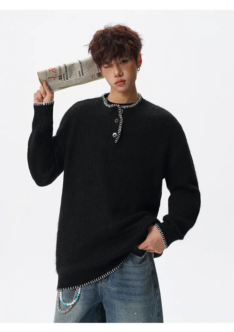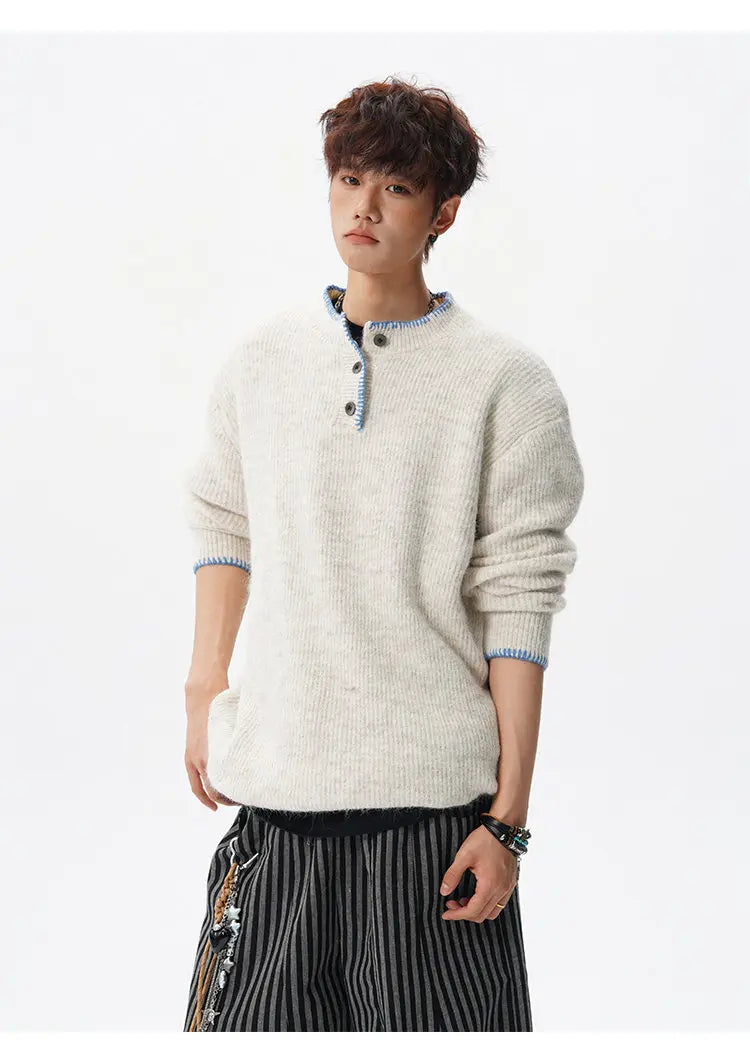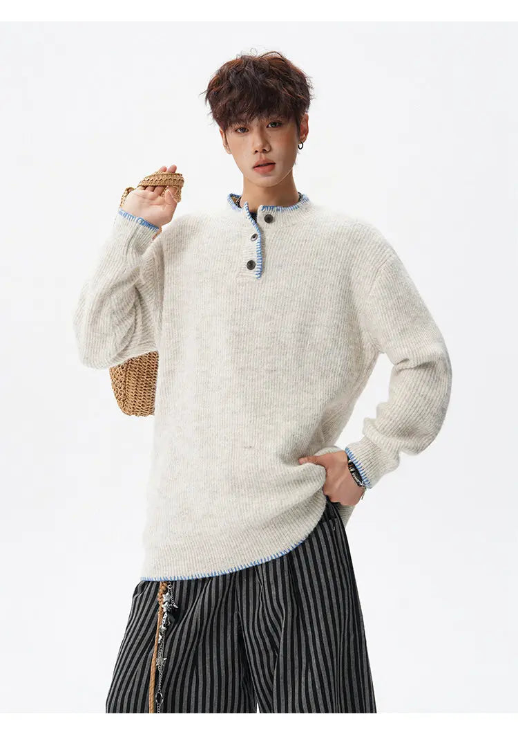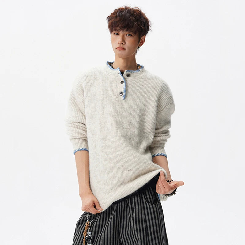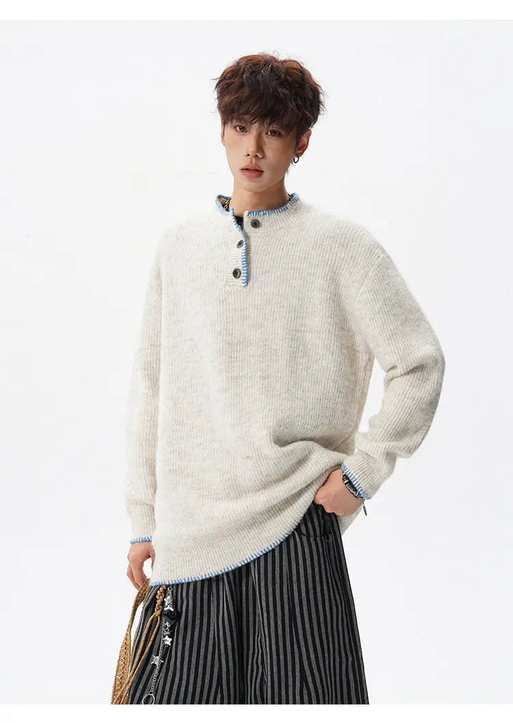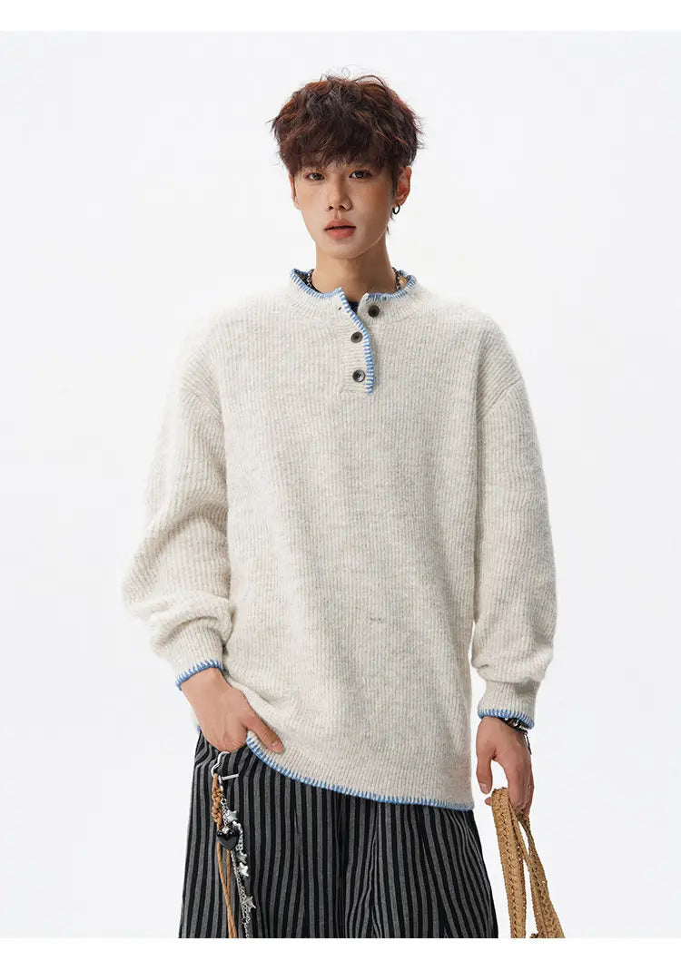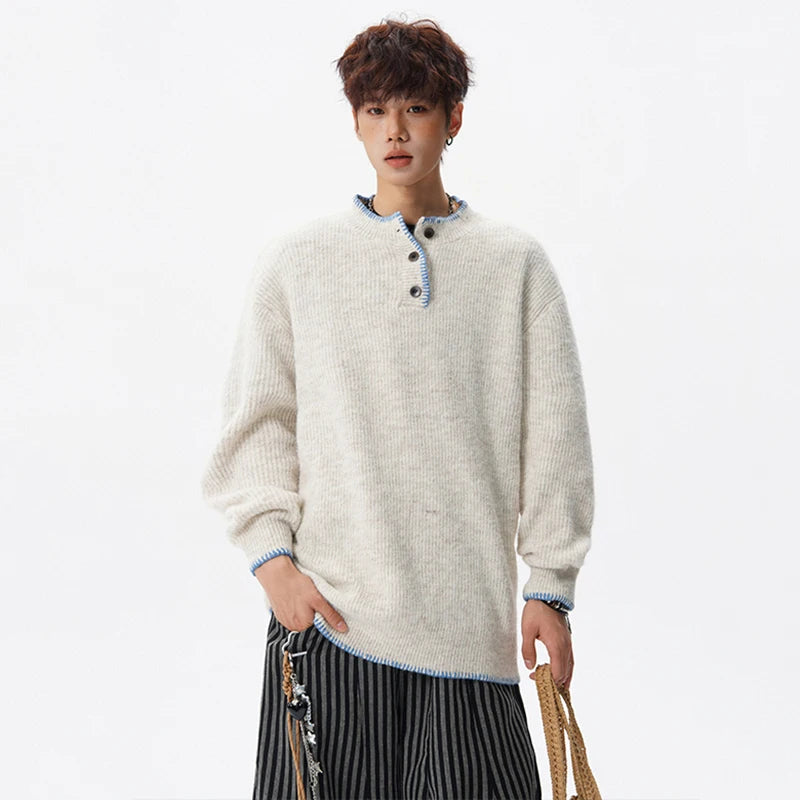 Designed for casual wear in autumn and winter seasons.This loose-fit knit pullover features a clean solid design with subtle button detailing.A modern essential for effortless everyday layering.