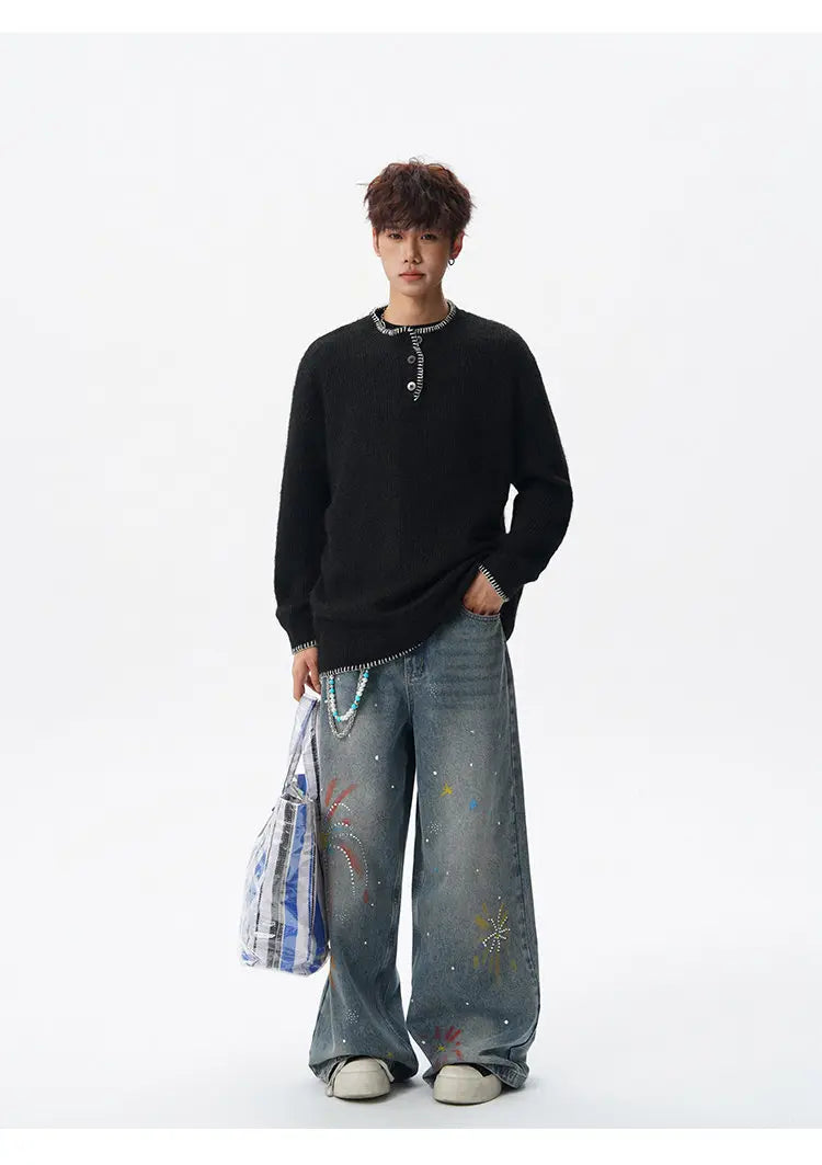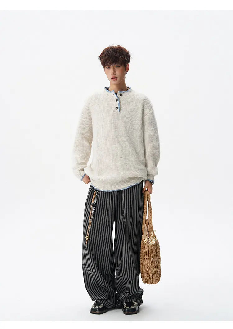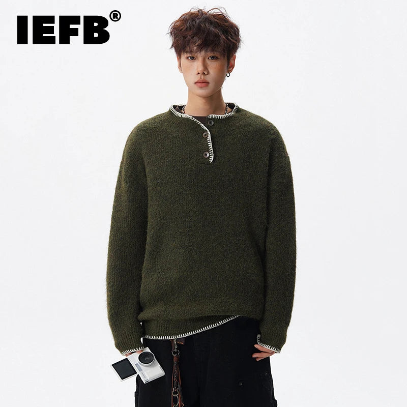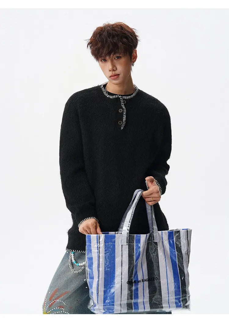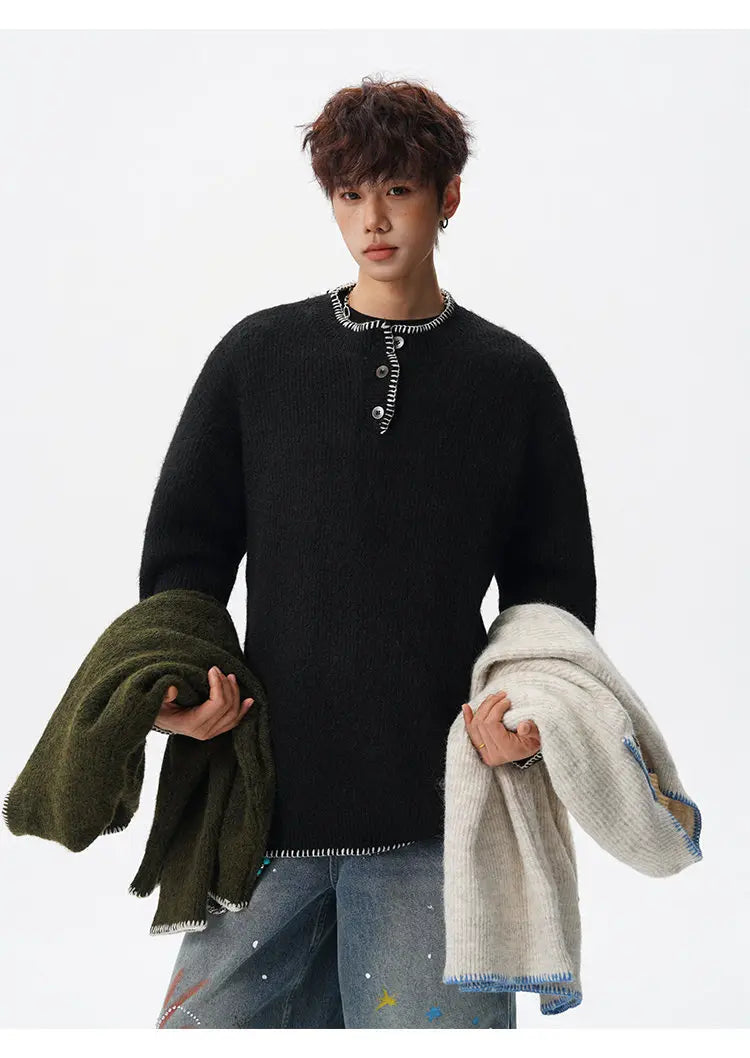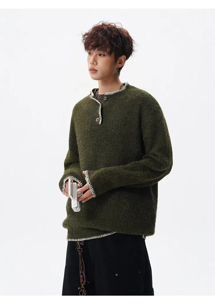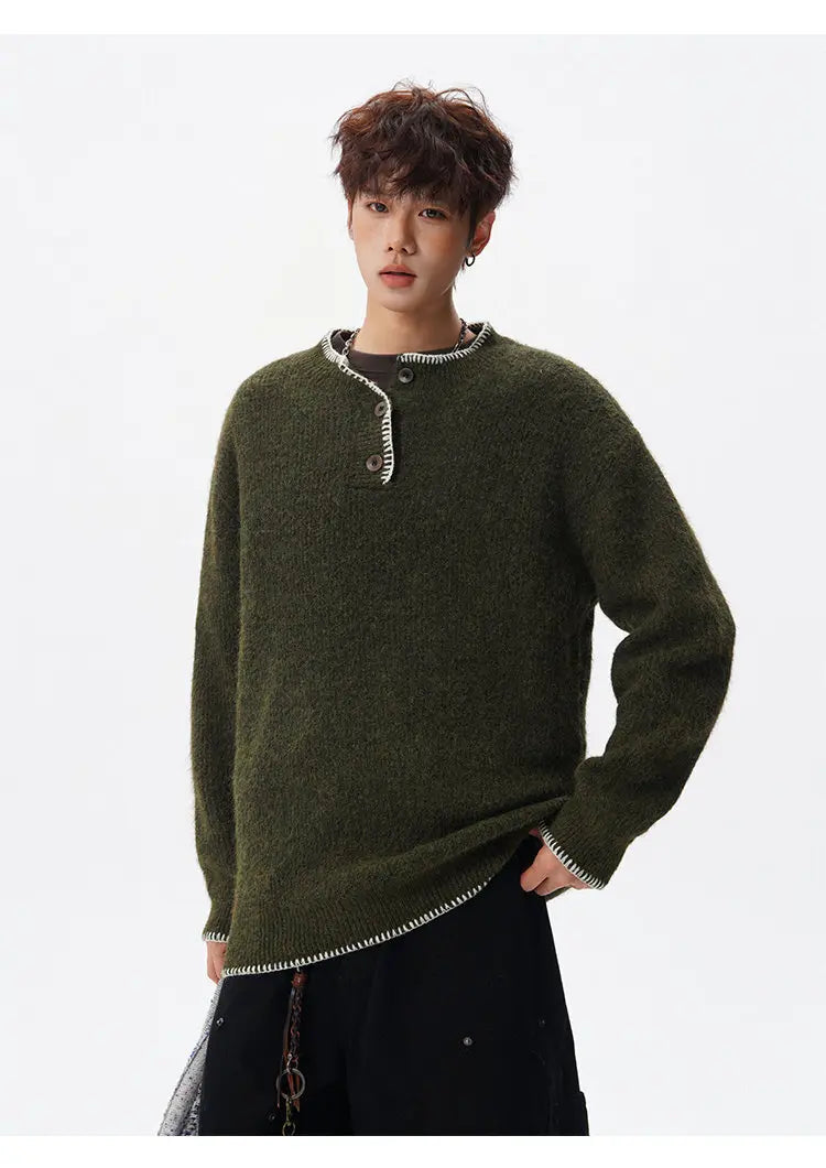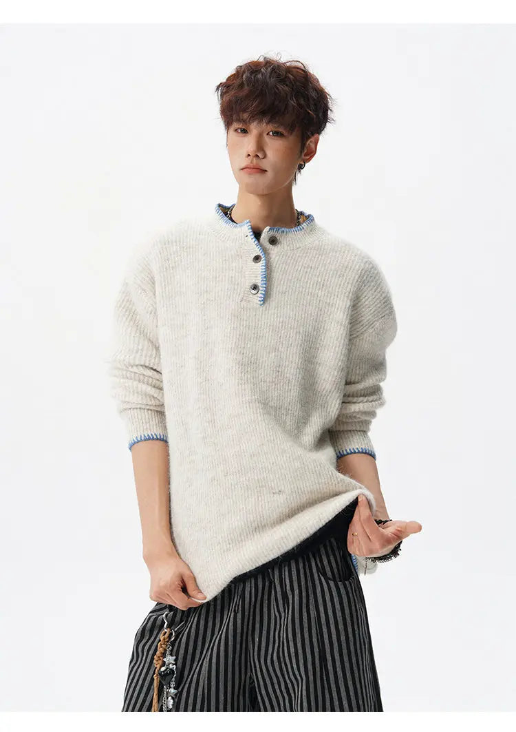 Designed for casual wear in autumn and winter seasons.This loose-fit knit pullover features a clean solid design with subtle button detailing.A modern essential for effortless everyday layering.