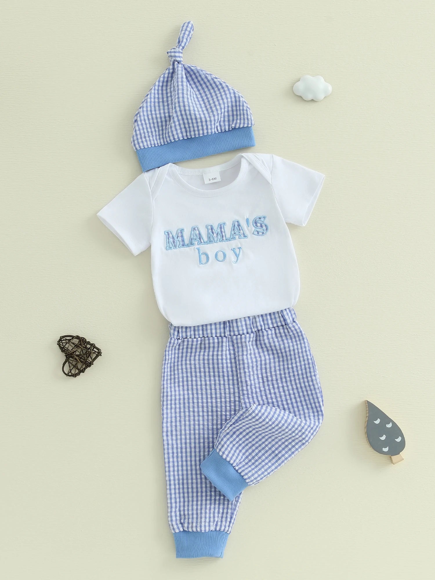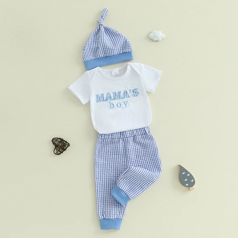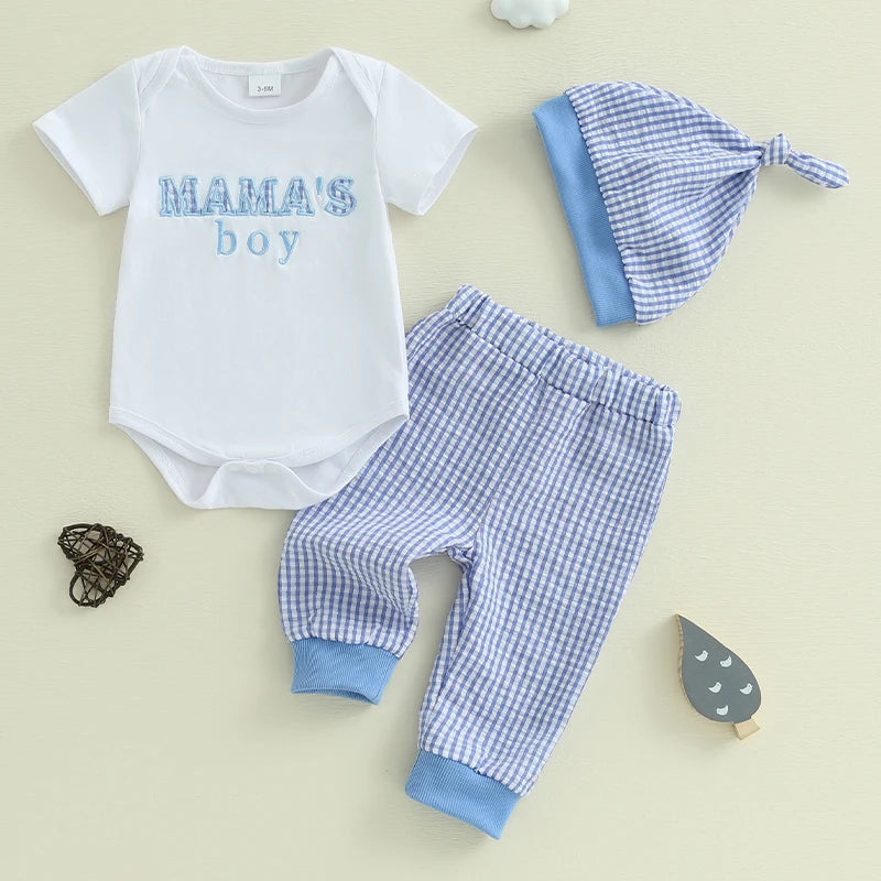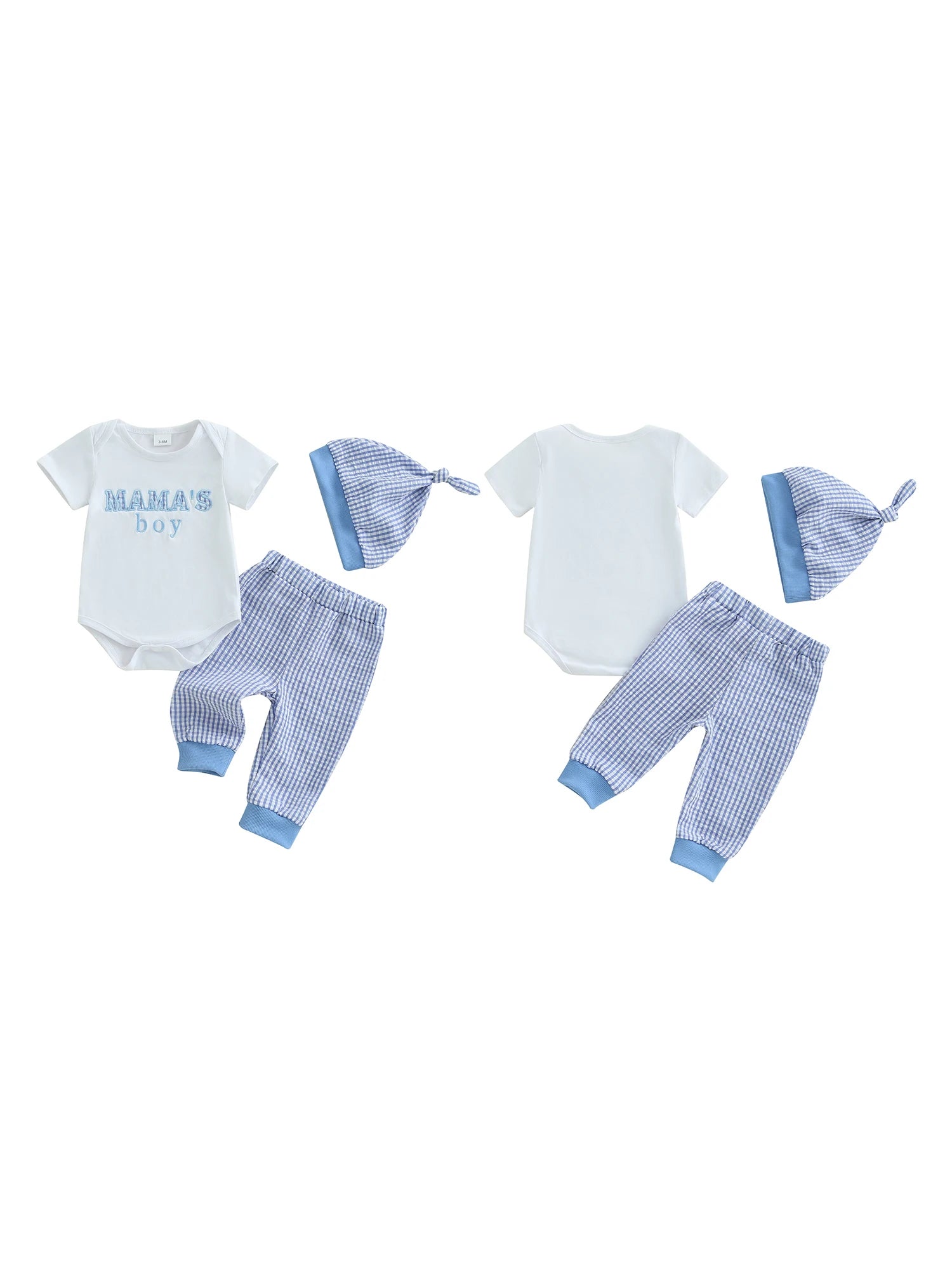 A coordinated three-piece outfit set designed for baby boys. Features a short sleeve romper paired with plaid pants and a matching hat. Suitable for daily wear across all seasons.