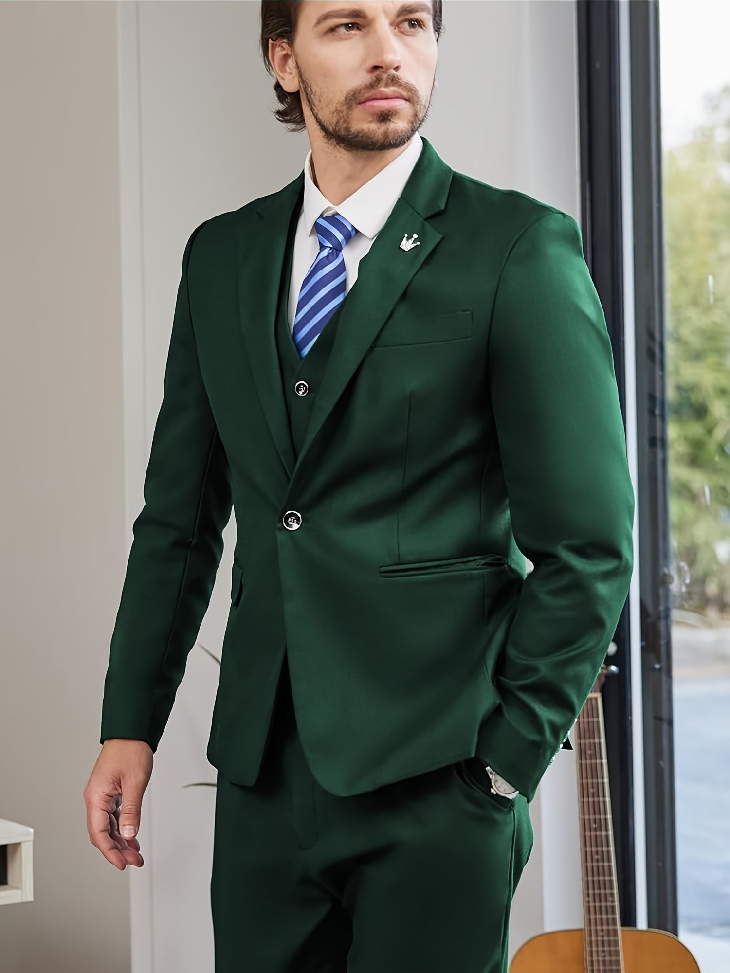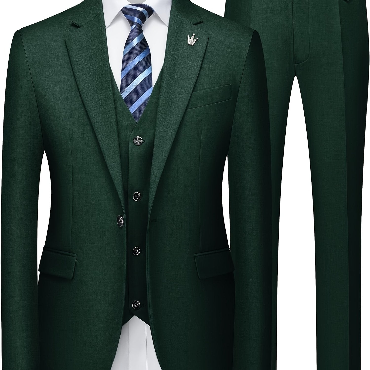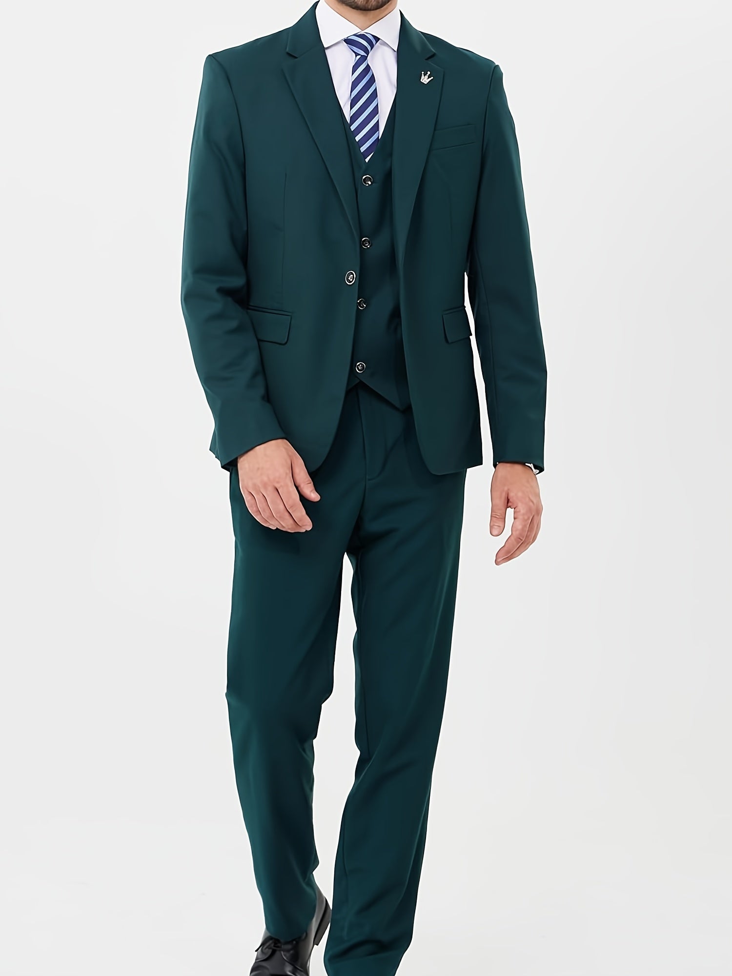 Three-piece woven suit set designed for formal and business occasions. Slim tailored contour with a clean solid surface and structured finish.