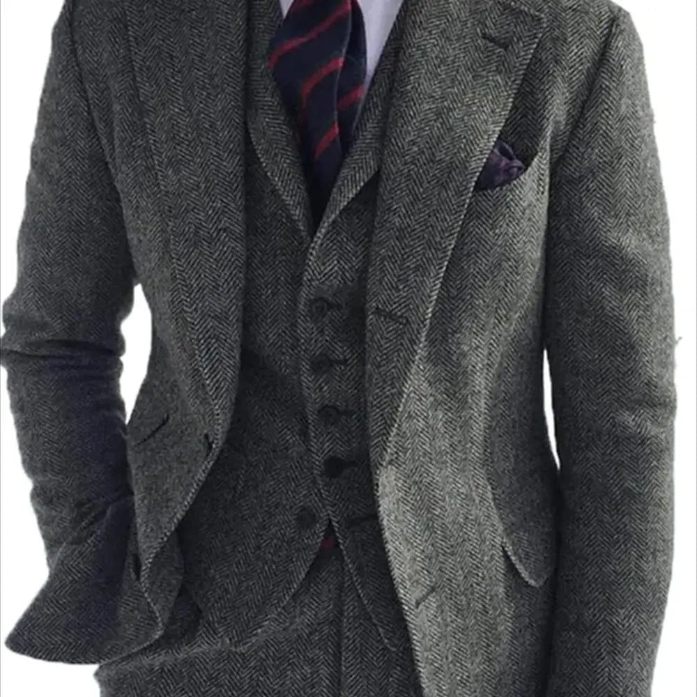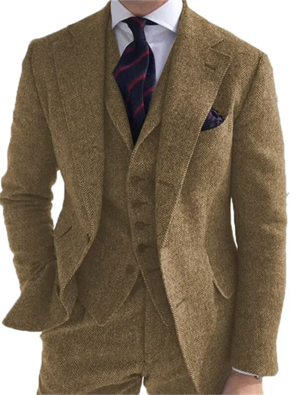 A refined three-piece suit crafted for business and formal occasions.Classic tweed texture delivers a timeless retro appeal.