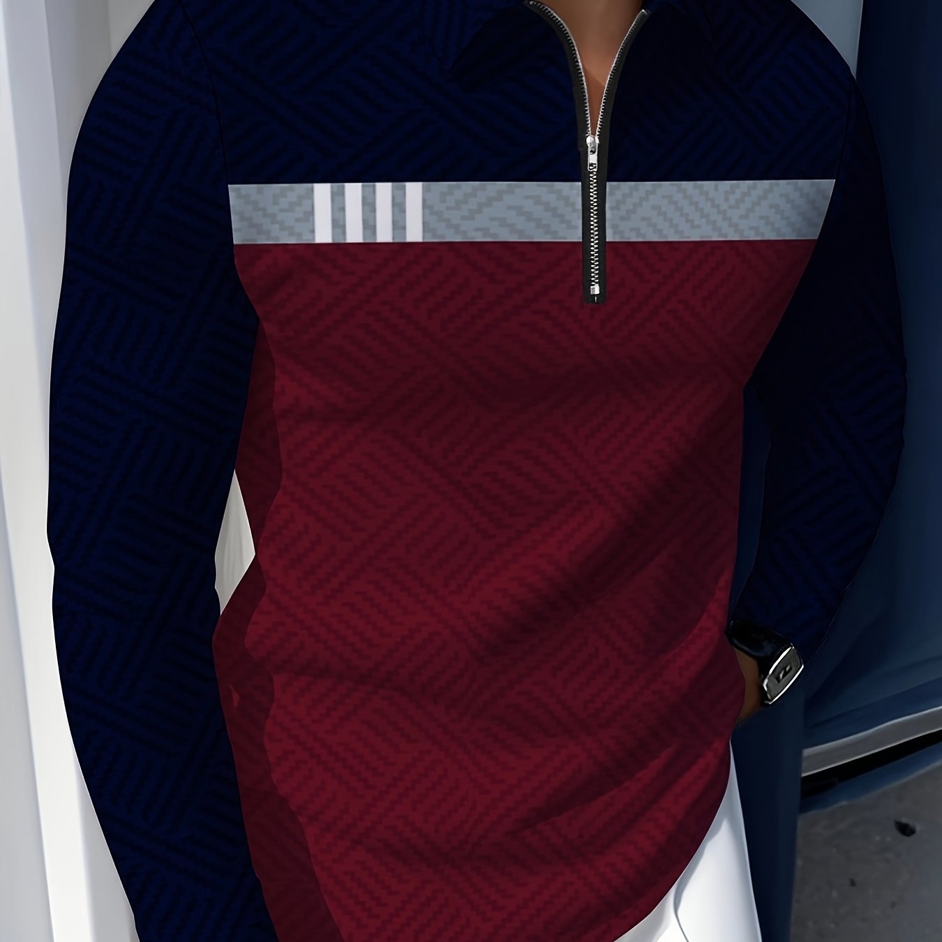 A long sleeve polo designed for clean, versatile wear.Regular fit with soft knit texture and light stretch for comfort.Finished with a geometric pattern and metallic zip detail.