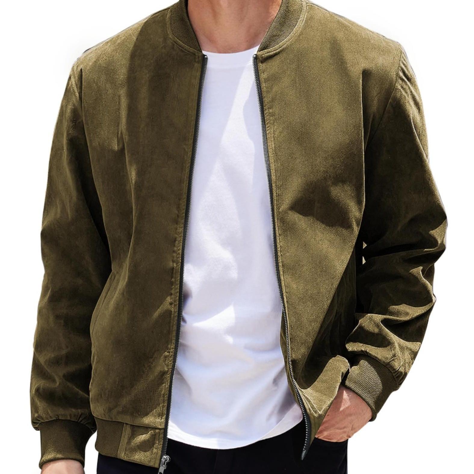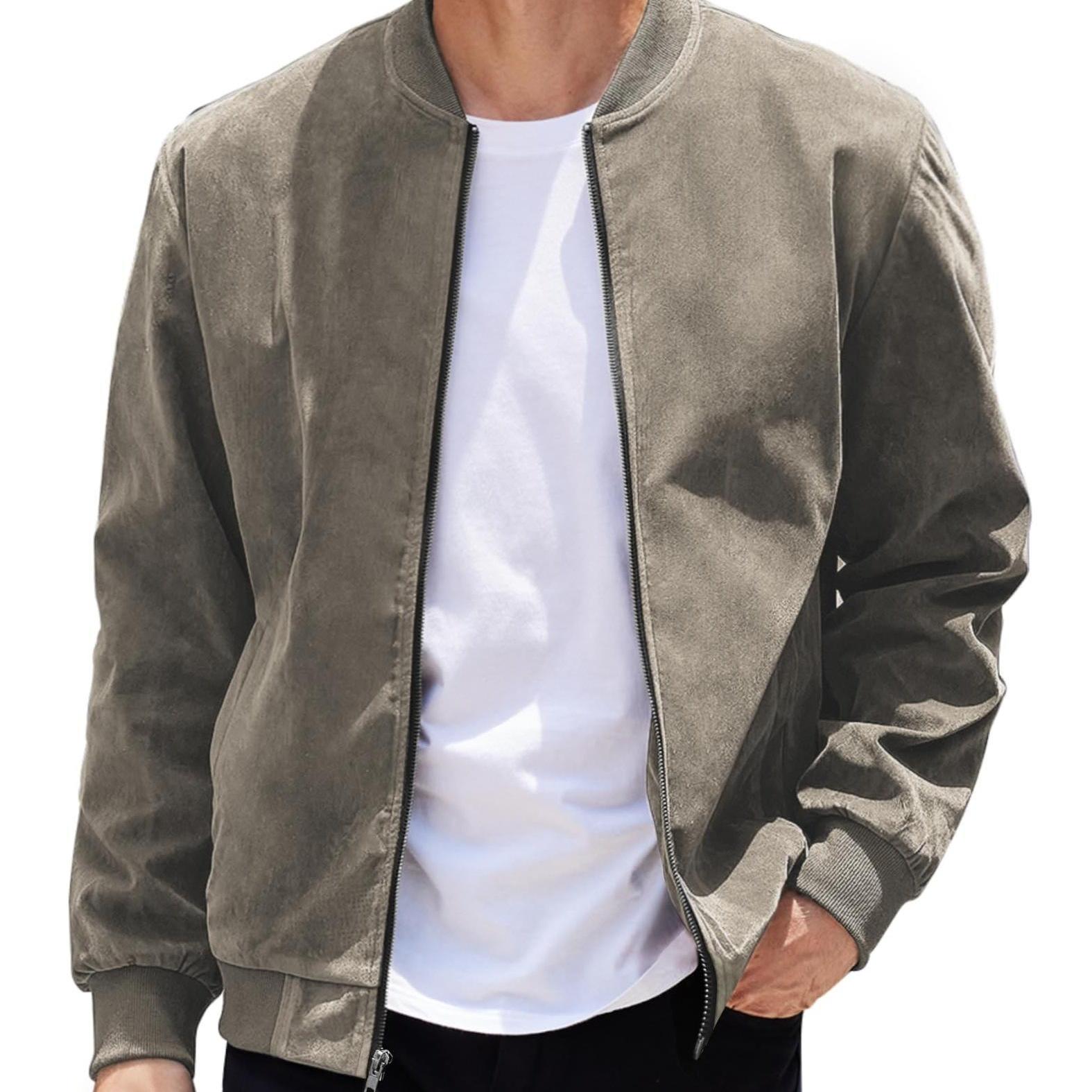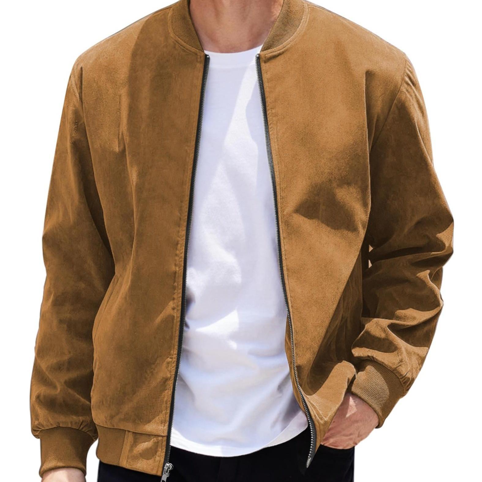 A lightweight varsity-inspired bomber jacket with a smooth suede-style finish. Designed with a clean crew-neck silhouette and zip-up front for effortless everyday casual wear.