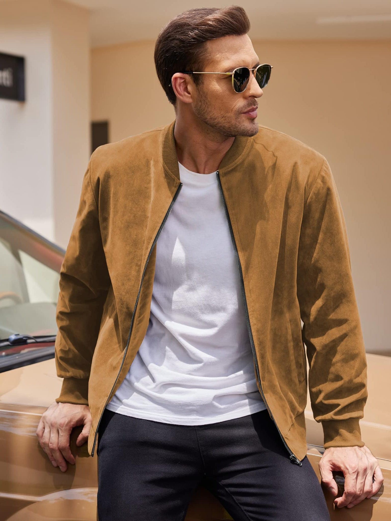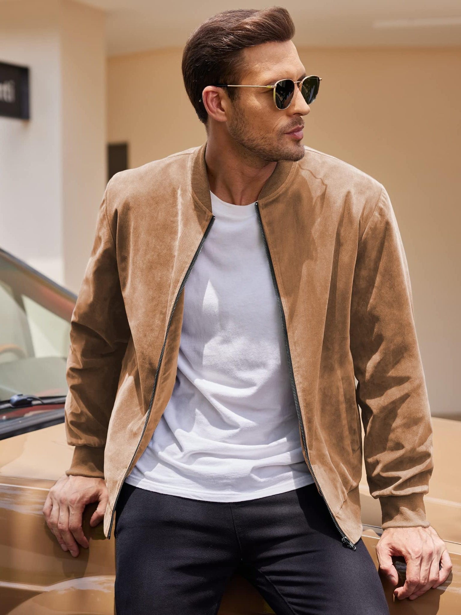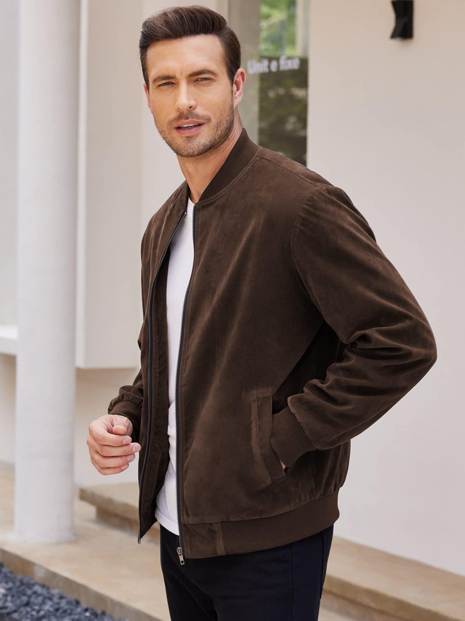 A lightweight varsity-inspired bomber jacket with a smooth suede-style finish. Designed with a clean crew-neck silhouette and zip-up front for effortless everyday casual wear.