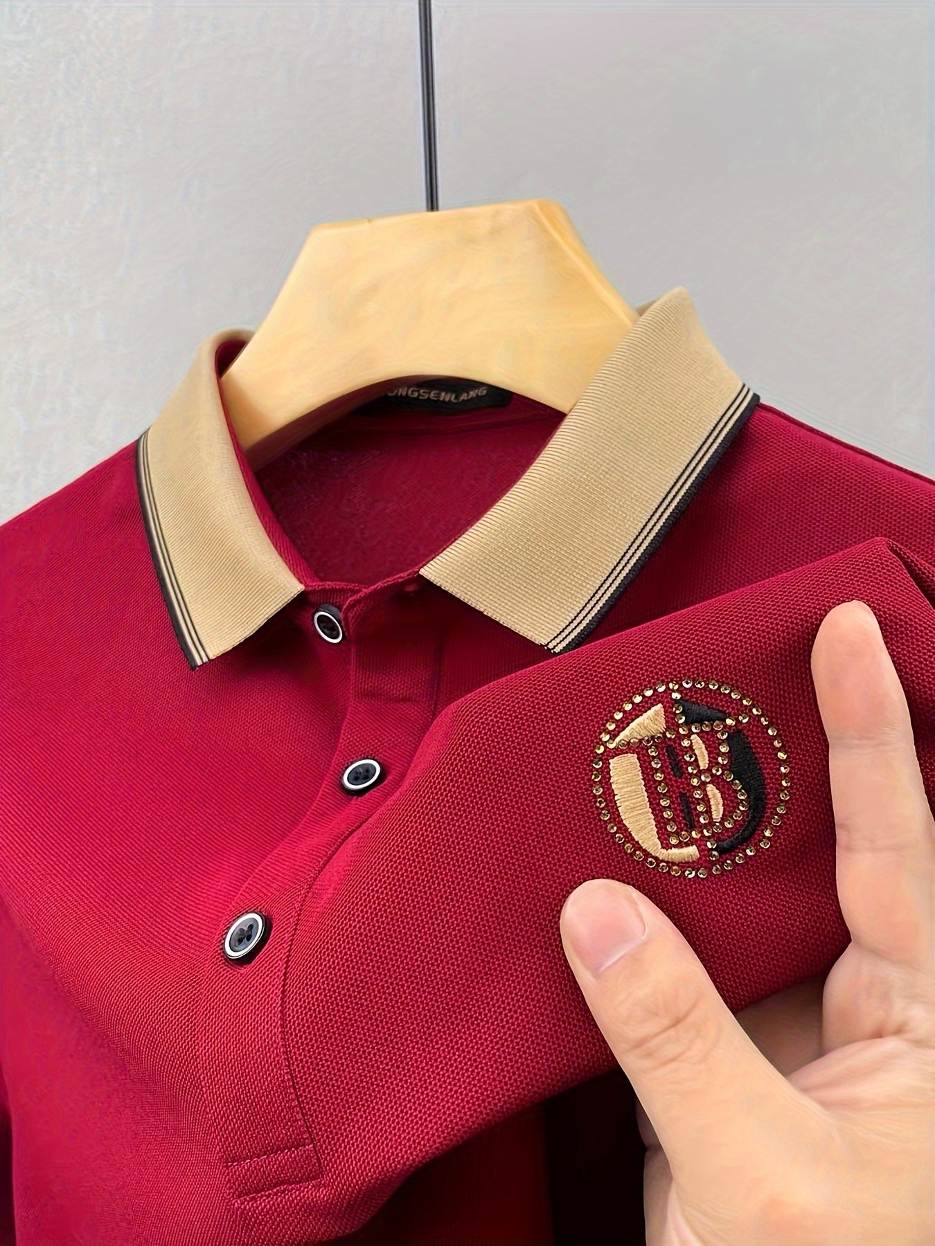 A casual polo designed for clean summer styling.Regular fit with soft knit texture and medium stretch for comfort.Finished with embroidered geometric detail and subtle rhinestone accents.