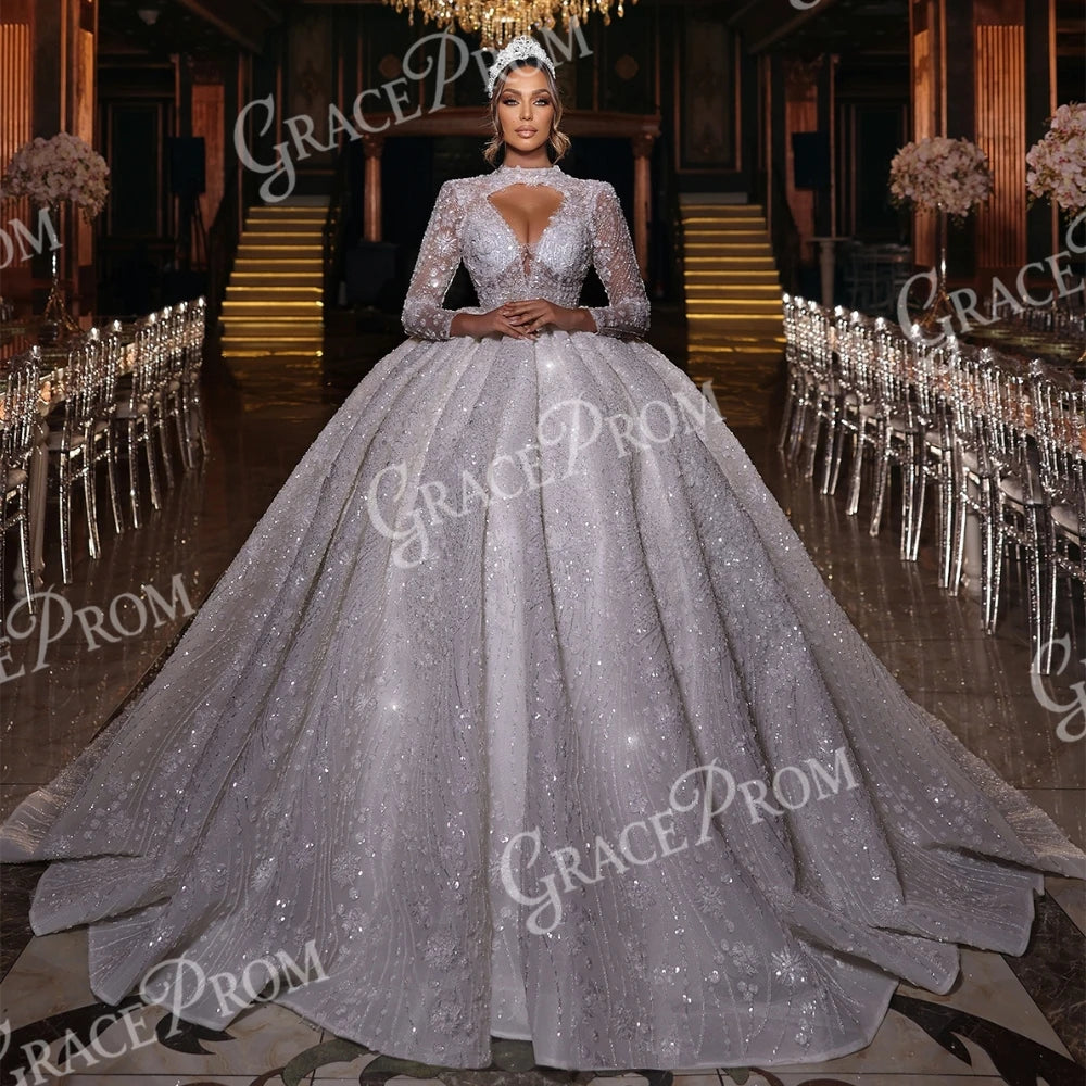 A shimmering floral bridal gown designed with delicate appliques and a dramatic court train. Crafted to bring a romantic, princess-like elegance to your wedding day.