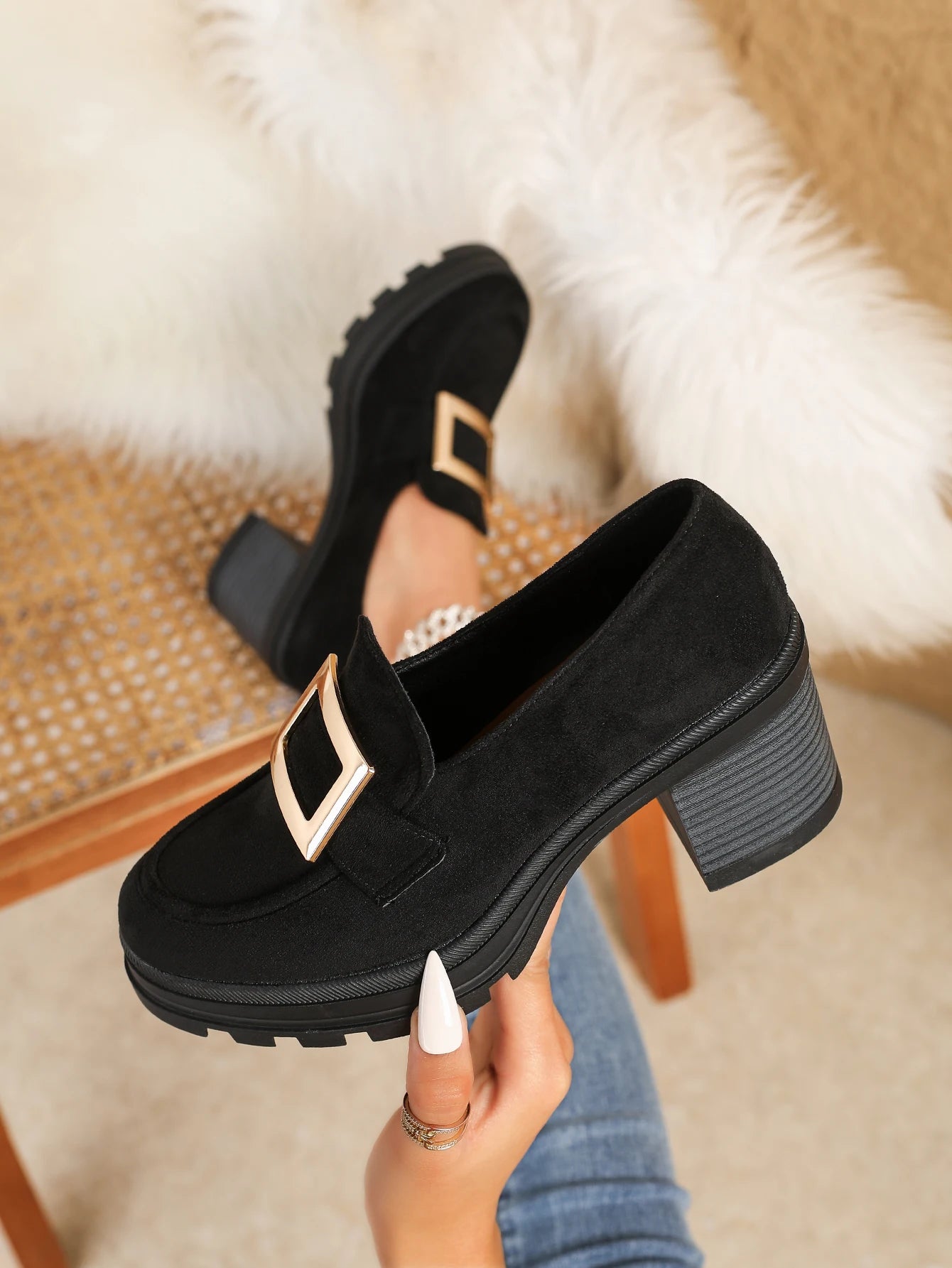 Retro-inspired single pumps designed for women with a thick sole and stable block heel. Styled with a round toe silhouette for balanced everyday wear. Suitable for spring and seasonal daily styling.