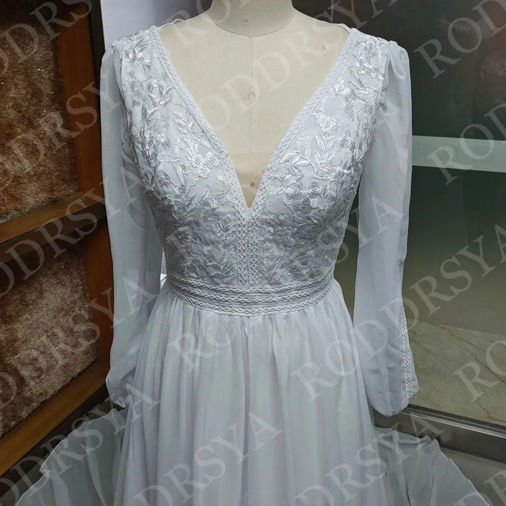 A romantic bohemian wedding gown designed for all-season ceremonies.Flowing A-line silhouette with lace detailing and elegant long sleeves.