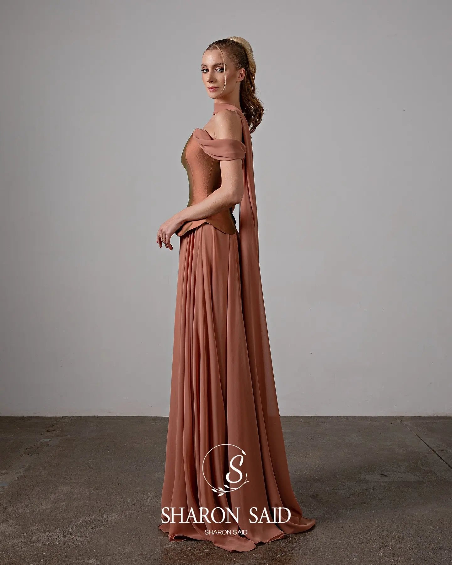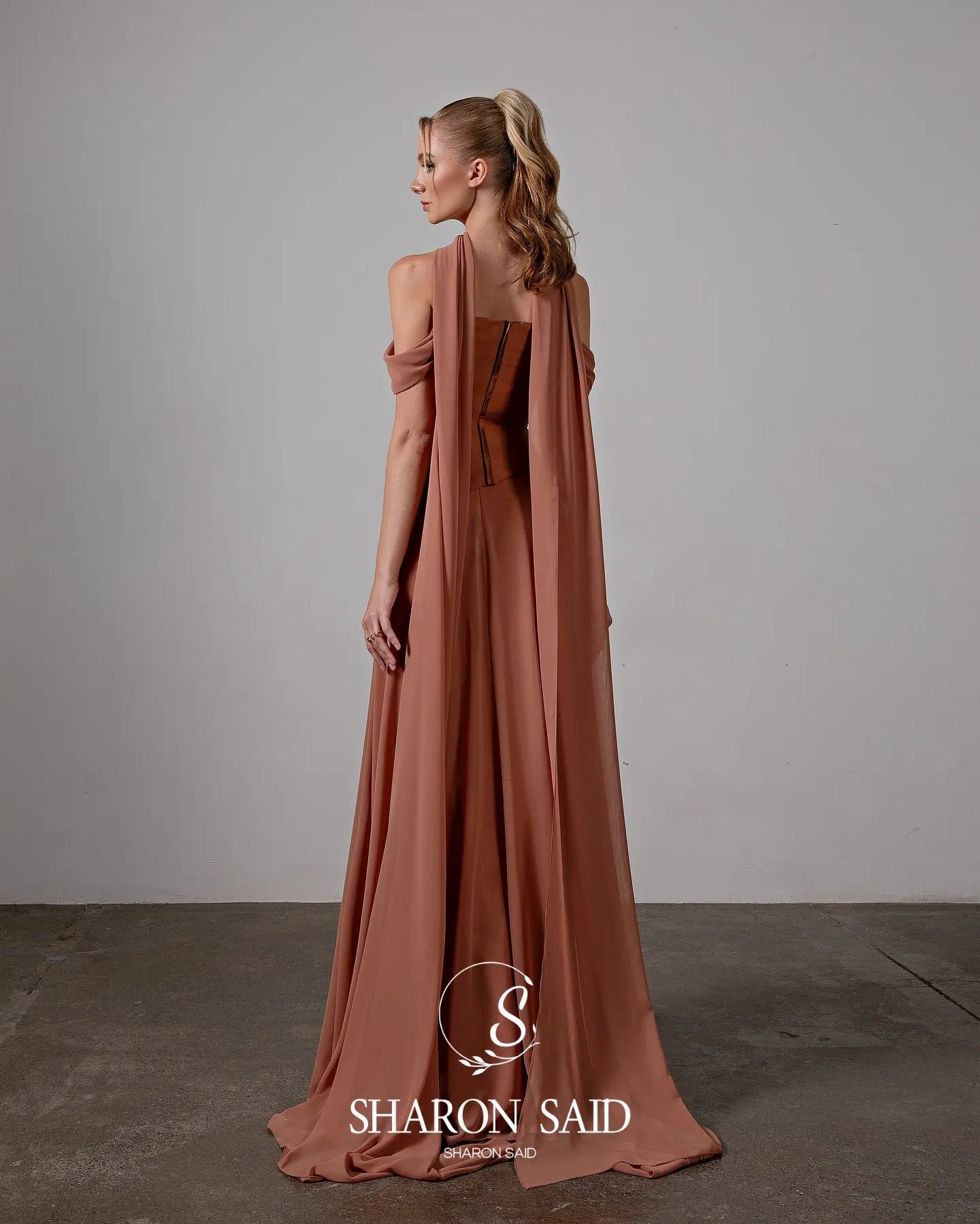 An elegant evening gown designed for formal occasions.Flowing chiffon with a soft draped look and graceful silhouette.
