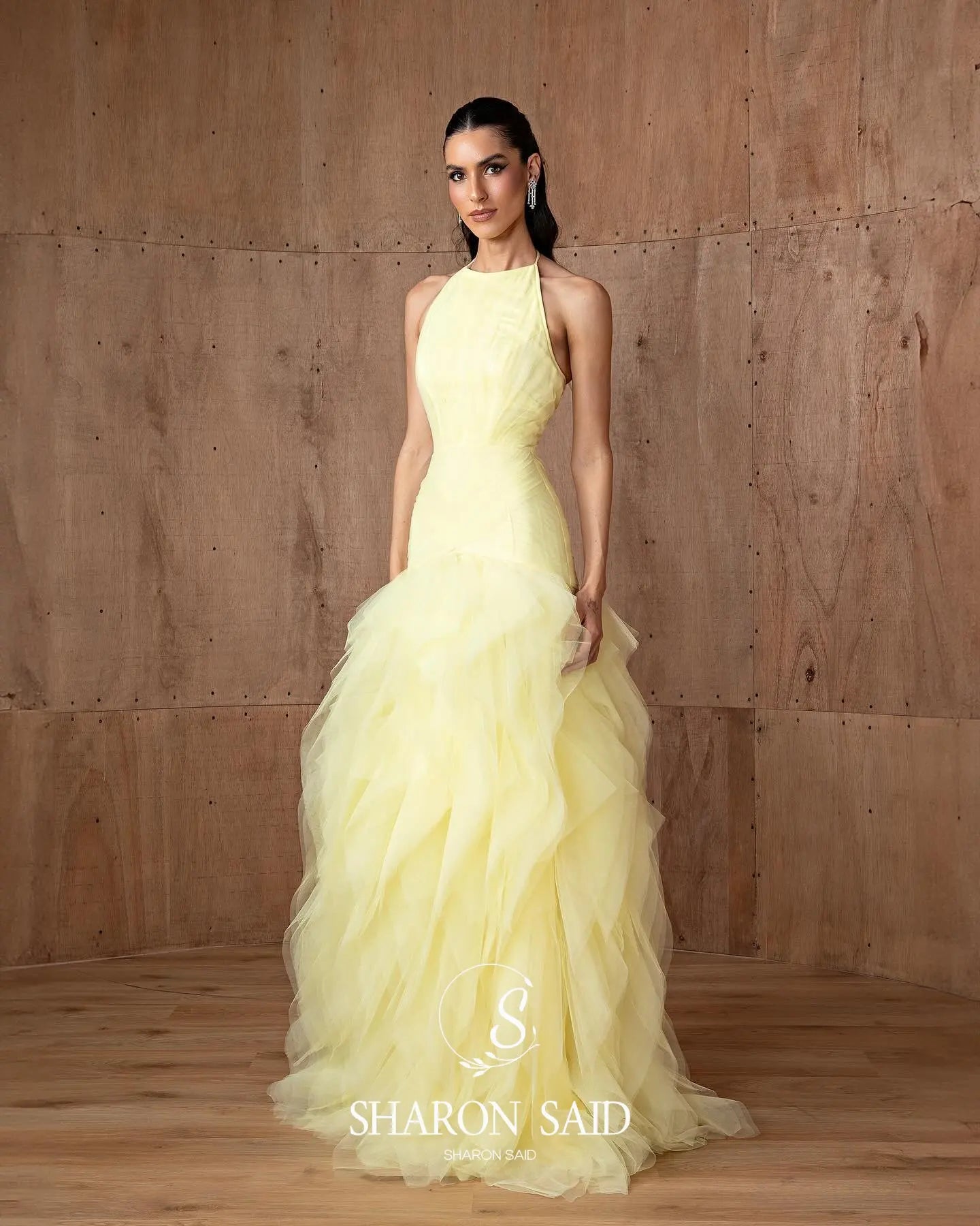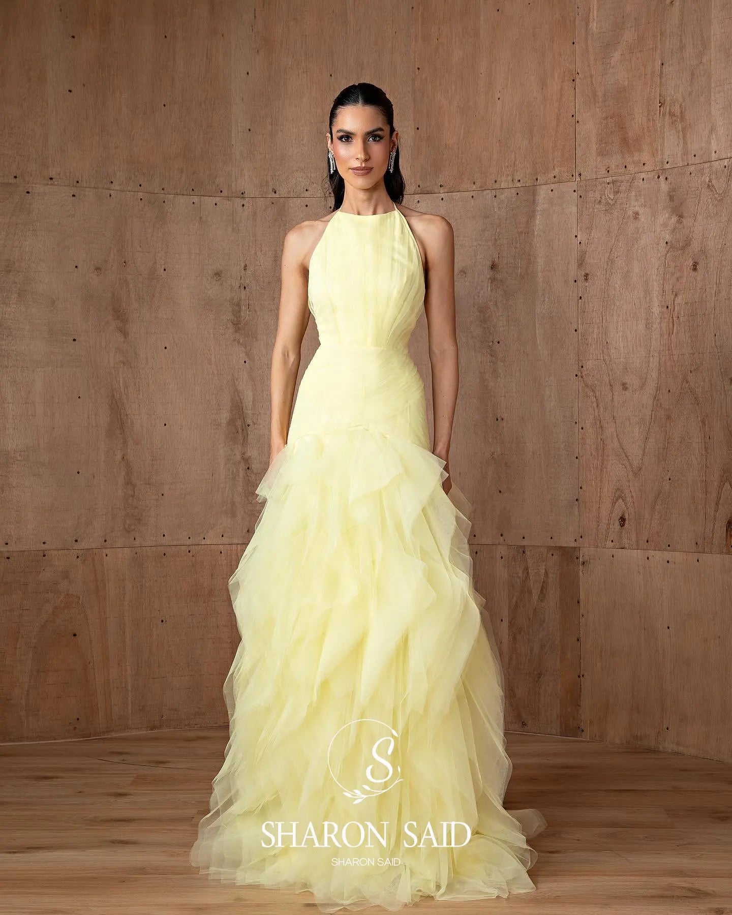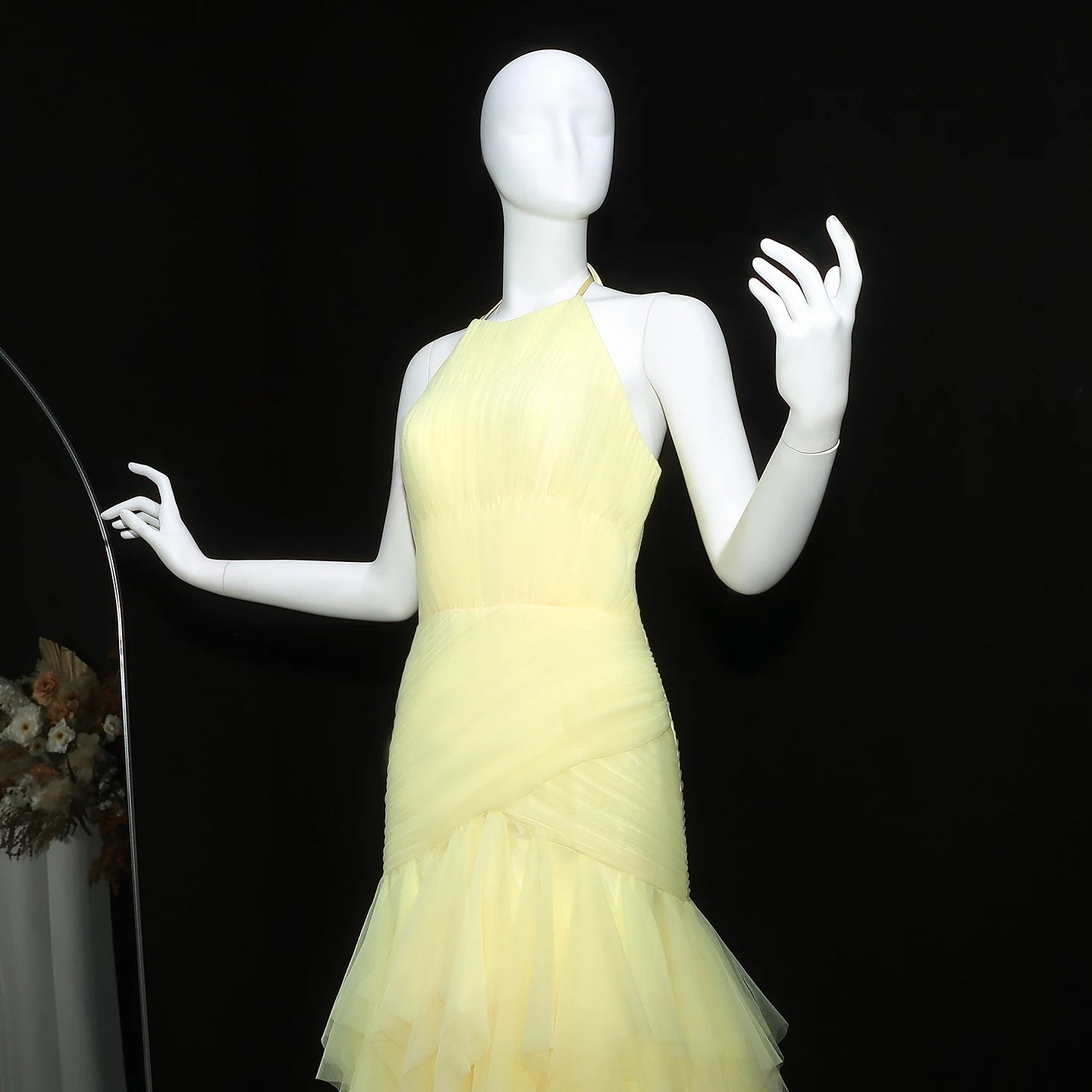 A refined evening gown designed for formal occasions.Elegant halter neckline with a flowing A-line silhouette.