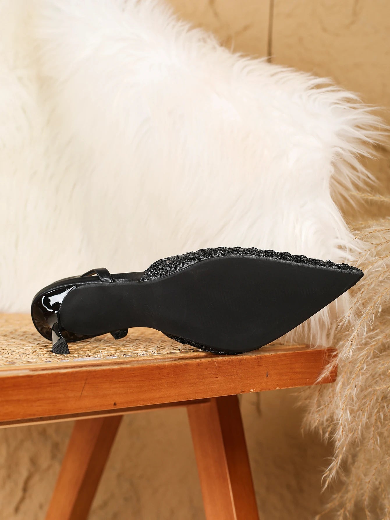 Elegant slip-on pumps designed for women with a sleek pointed toe silhouette. Finished with rhinestone glitter accents for a refined, dress-ready look. Suitable for summer events, work, and formal occasions.