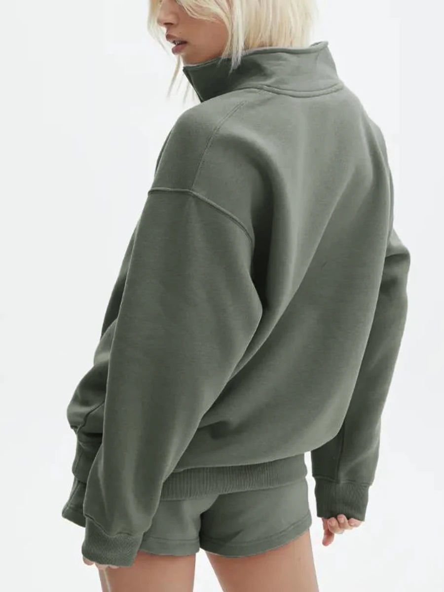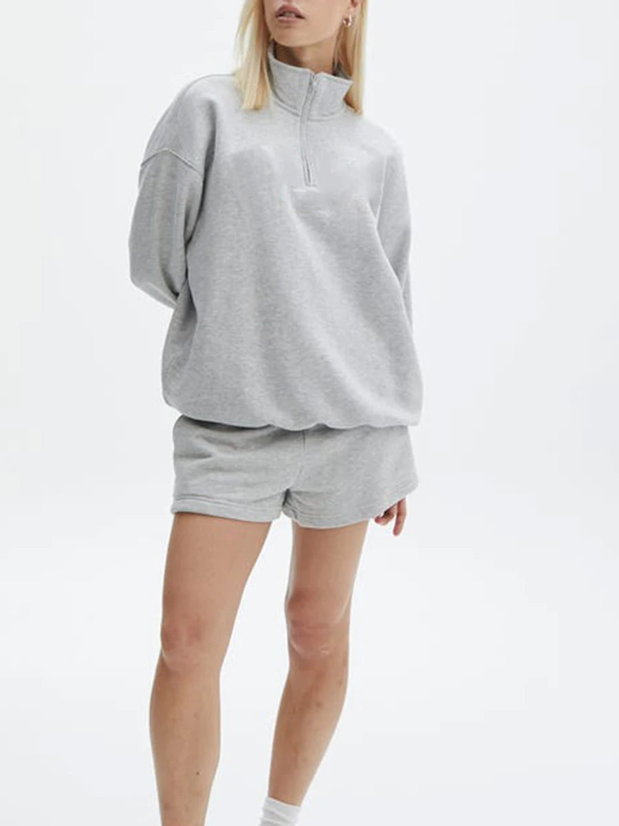 • Two-piece sweatshirt and shorts set• Stand collar zipped sweatshirt design• Long sleeve loose-fit top• Elastic waist regular shorts• Soft velvet fabric texture• Casual activewear-inspired style
