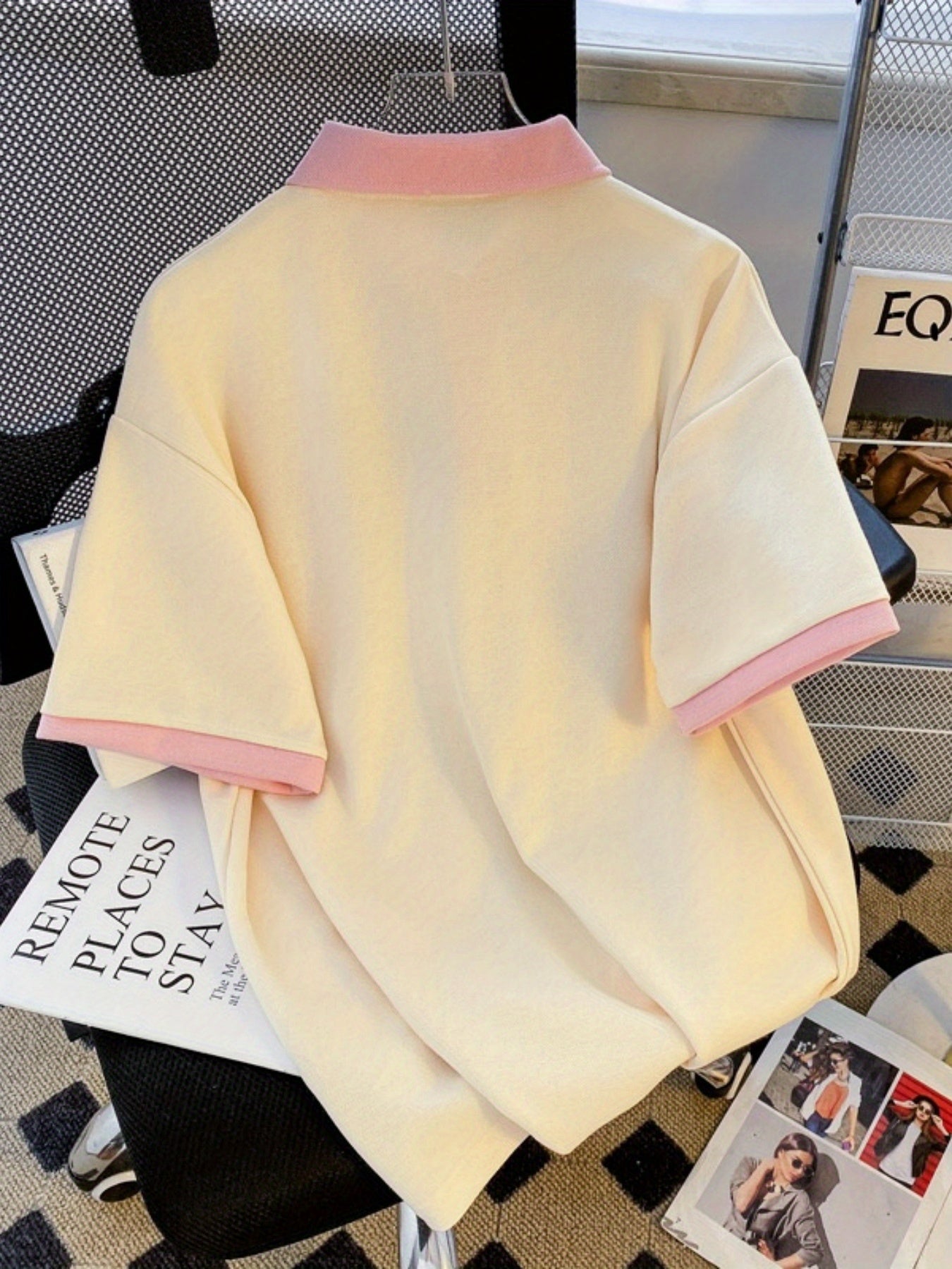 A casual polo designed for relaxed spring and summer wear.Loose silhouette with soft knit feel for everyday comfort.Finished with a playful embroidered detail and contrast trim.